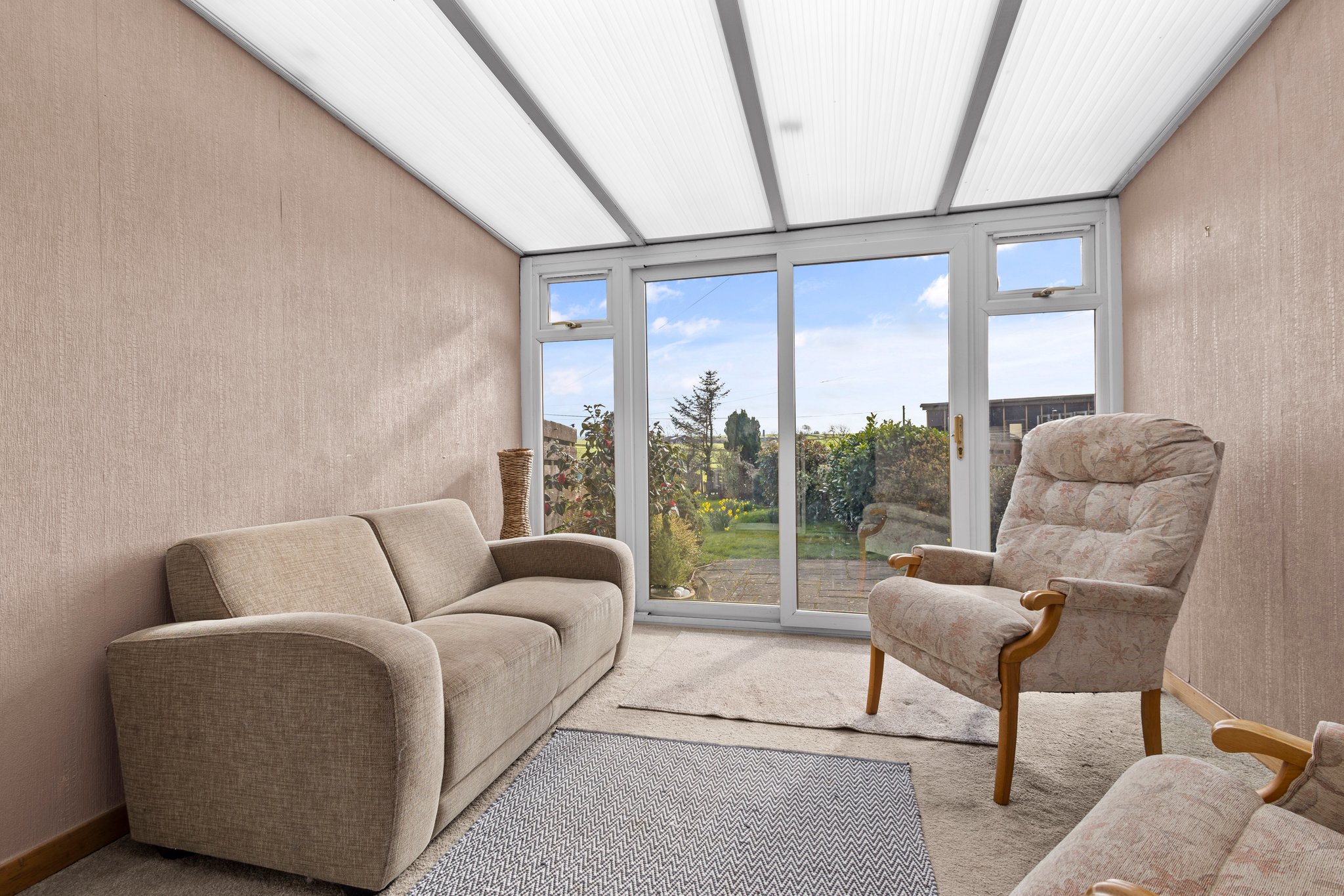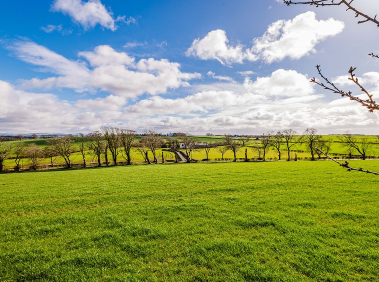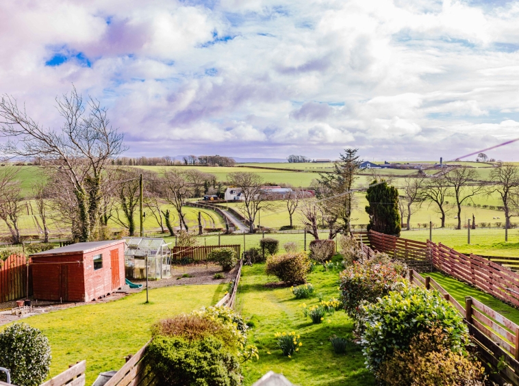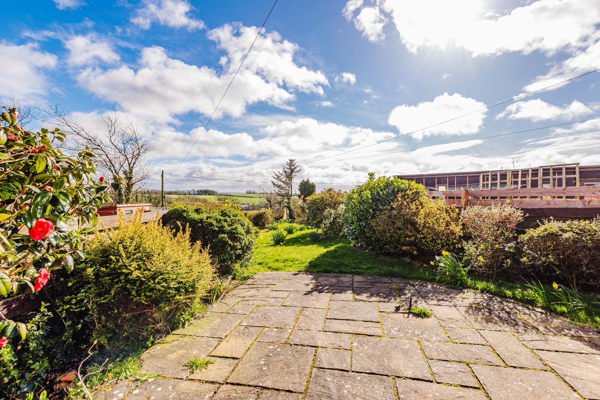 To the rear, the garden includes a large lawn, established planting, and a paved patio area—ideal for outdoor dining or simply relaxing while taking in the open countryside views.
