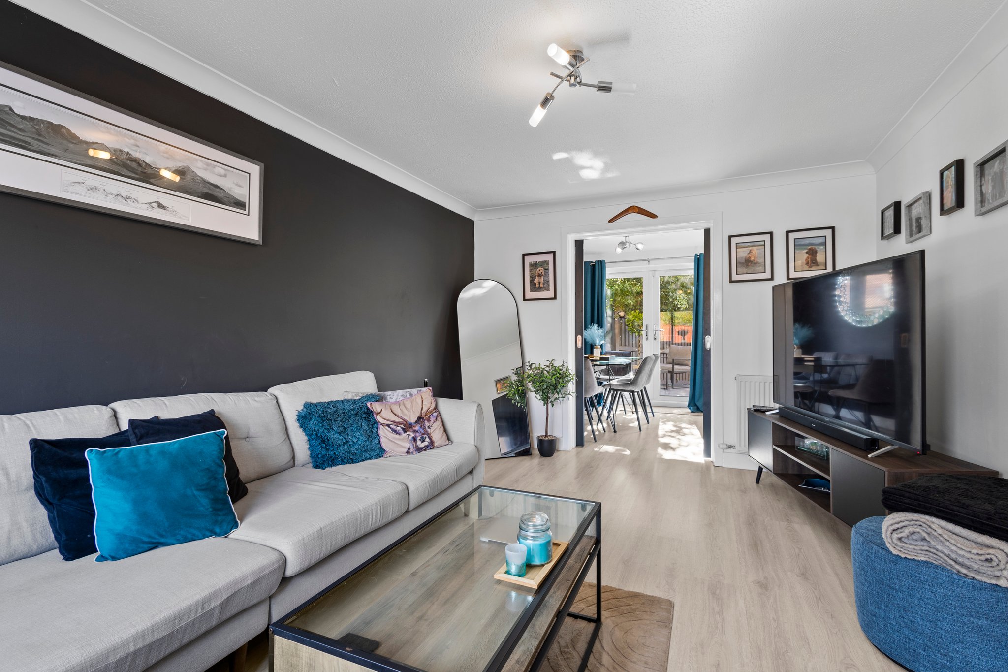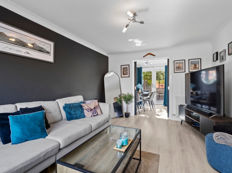 3.24m x 4.94m (10′ 8″ x 16′ 2″) The formal lounge is a generously proportioned main living apartment offering soft tasteful decor with ceiling coving, laminate flooring and double glazed window to the front. Plentiful space for freestanding furniture.