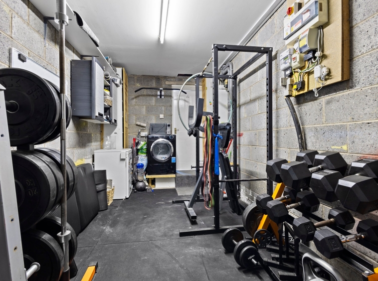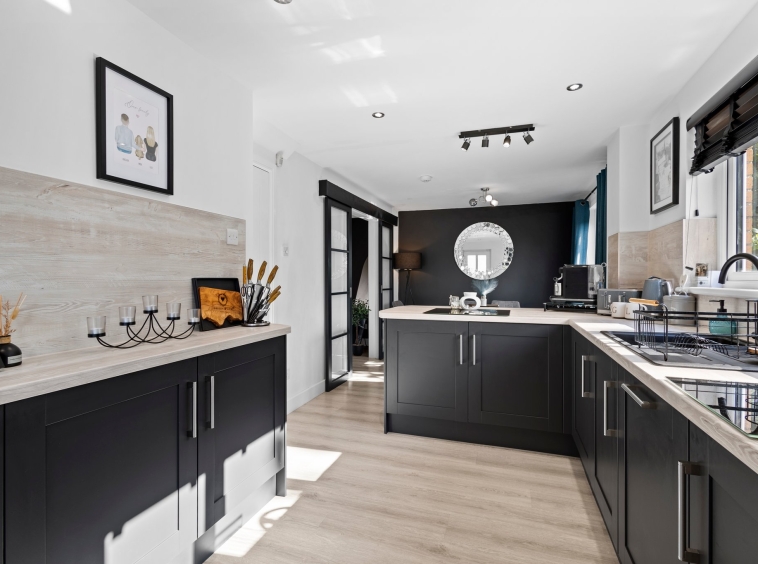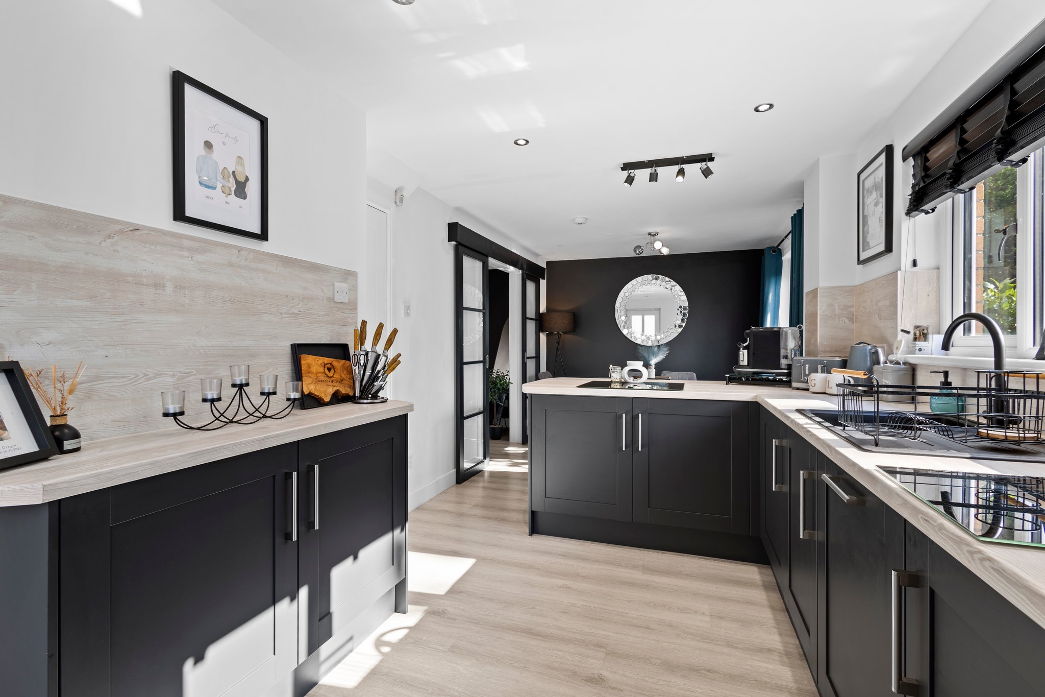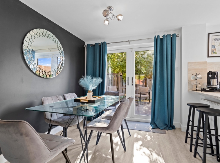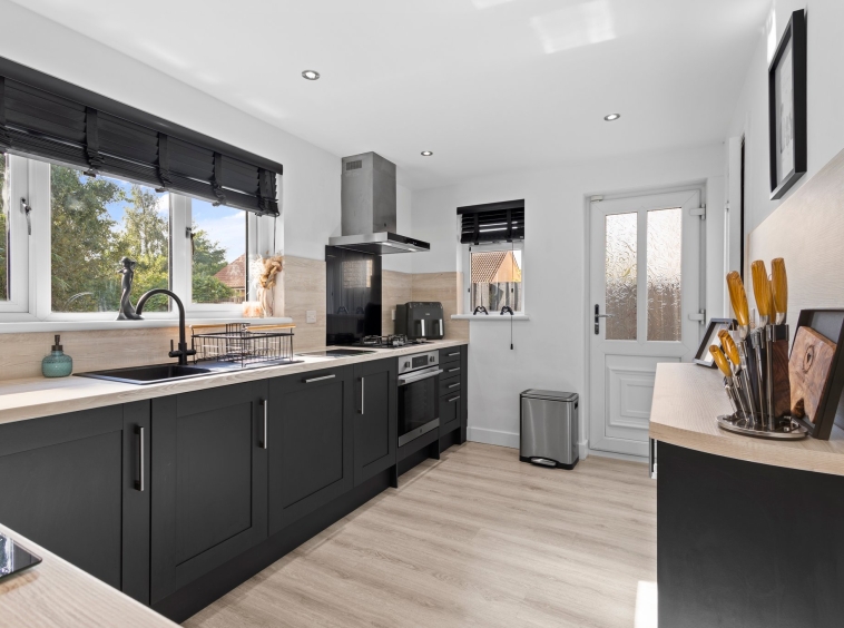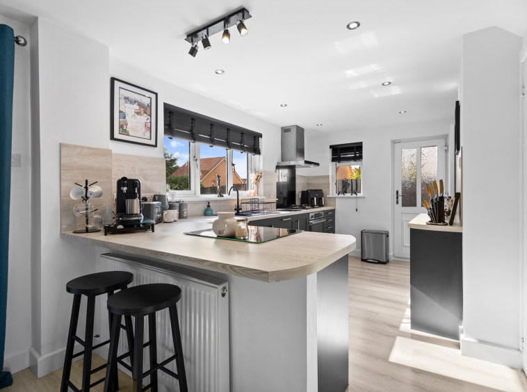 6.9m x 2.75m (22′ 8″ x 9′ 0″) Contemporary dining sized fitted kitchen providing a range of modern wall and base storage units with complementary work surfaces, composite sink and drainer, integrated appliances including gas hob, oven, washing machine, dishwasher and fridge. Neutral decor, ceiling spotlights, breakfast bar seating area and ample space for dining table and chairs. Double glazed windows to the side and rear, French doors leading out into the rear gardens.