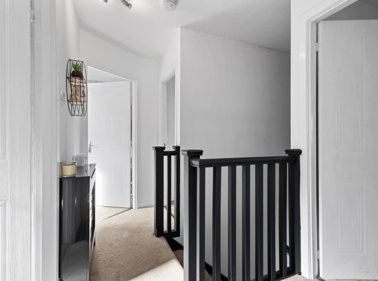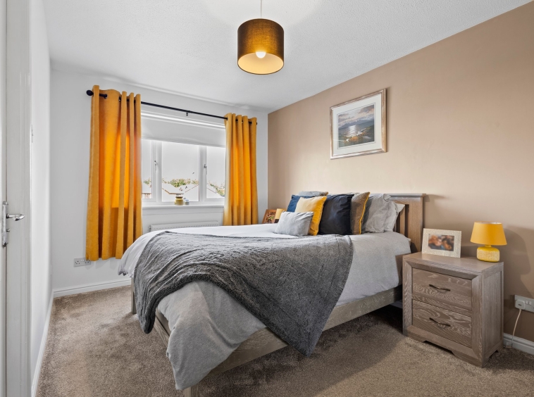 3.25m x 4.13m (10′ 8″ x 13′ 7″) On the upper level the master bedroom is a generous double with modern decor, fitted carpet and double door fitted wardrobes providing storage space. Double glazed window to the front.