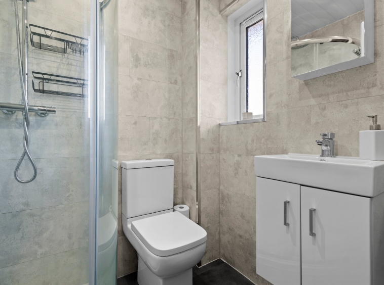 1.39m x 1.85m (4′ 7″ x 6′ 1″) Three piece master en suite comprising of a wash hand basin, wc and shower cubicle with mains overhead shower. Contemporary wet wall finish around walls, heated towel rail, ceiling spotlights and double glazed opaque window to the front.