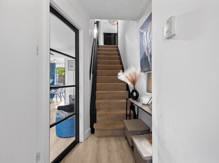1.28m x 2.56m (4′ 2″ x 8′ 5″) The welcoming entrance hallway is complete with modern decor and laminate flooring, carpeted staircase to the upper level, door access to lounge and a carpeted staircase leads to the upper level.