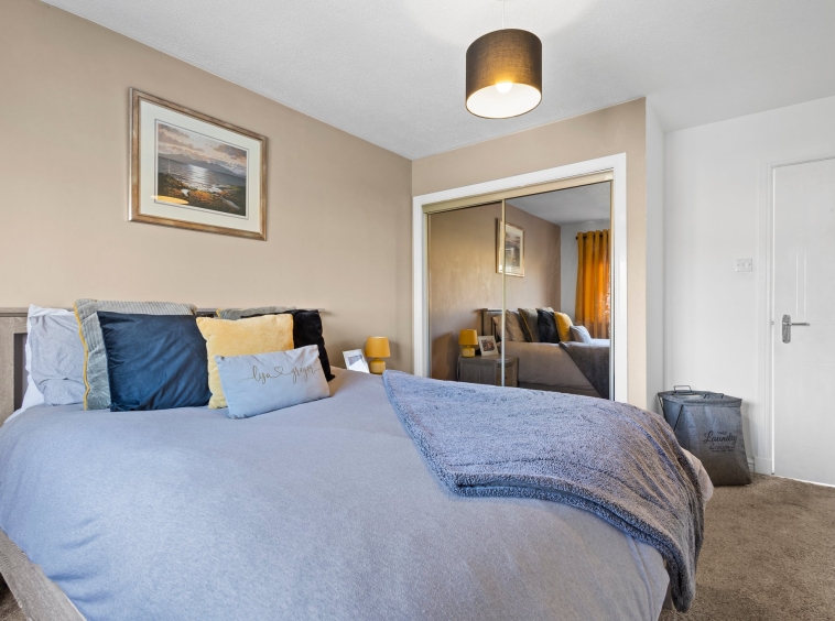 2.56m x 3.77m (8′ 5″ x 12′ 4″) The second double bedroom offers tasteful decor, fitted carpet, double door fitted wardrobes and a front facing double glazed window.
