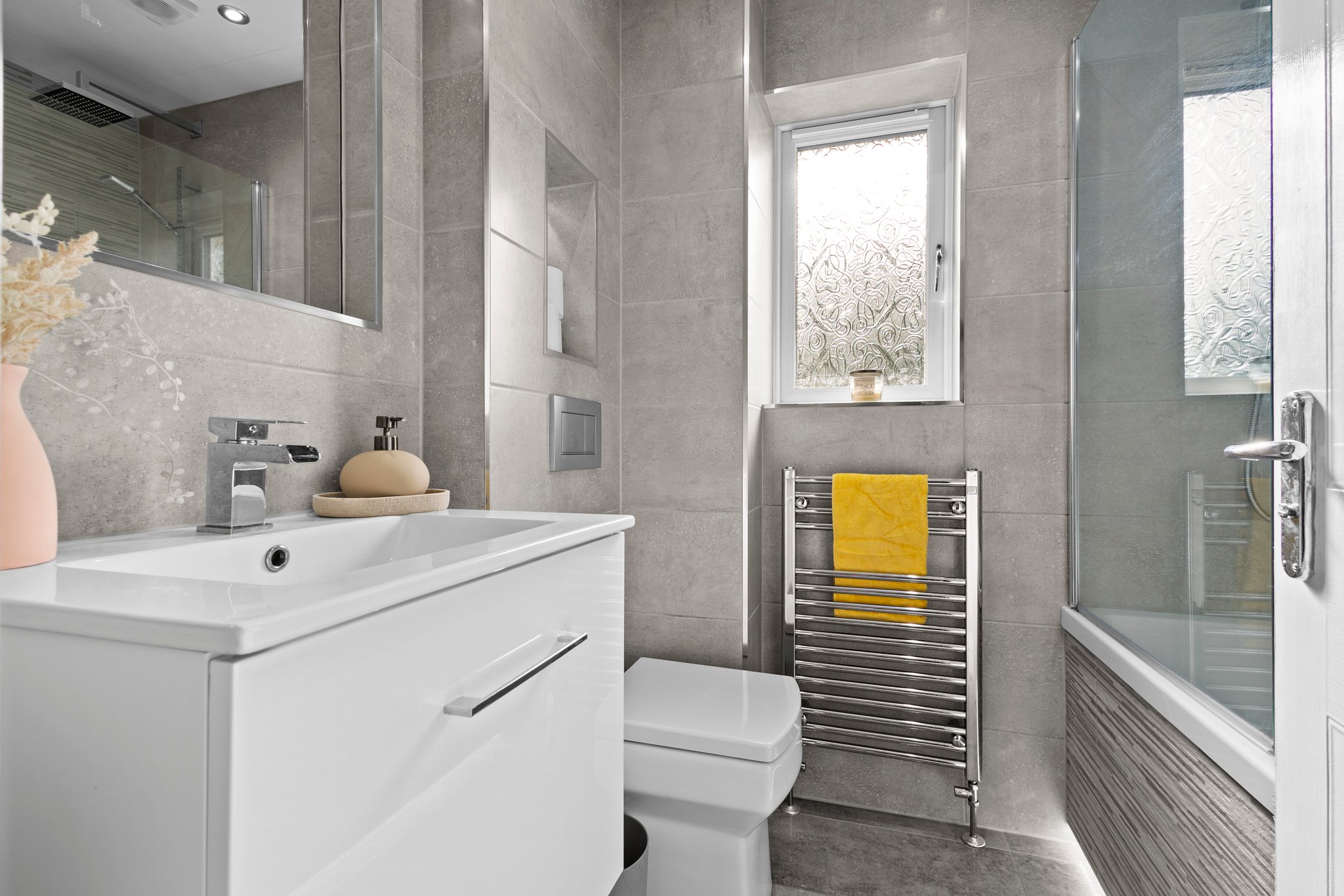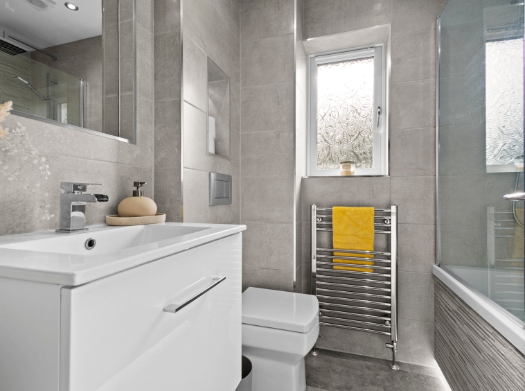2.03m x 1.68m (6′ 8″ x 5′ 6″) Completing the accommodation is the three piece family bathroom suite comprising of wash hand basin with vanity storage, wc and bath with overhead mains shower. Contemporary fully tiled walls and floor, ceiling spotlights, heated towel rail and double glazed opaque window to the rear.