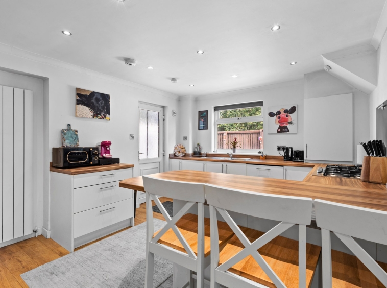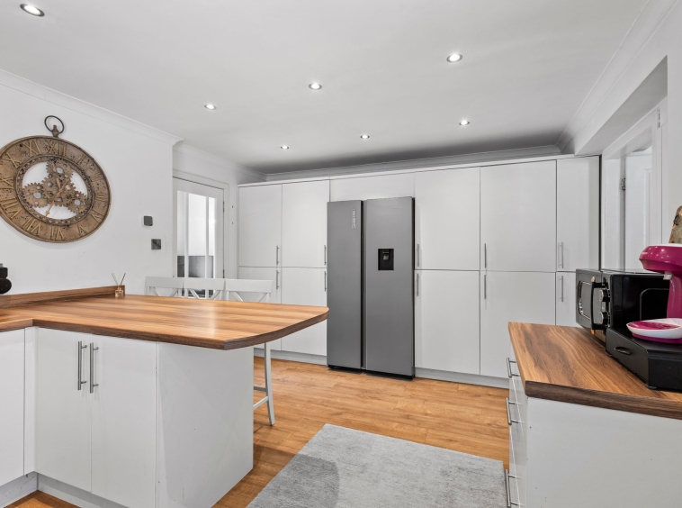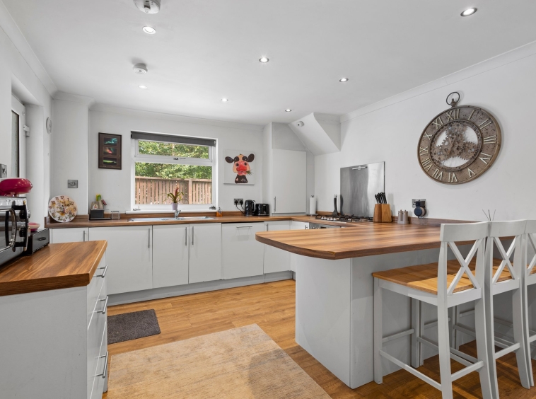 5.05m x 3.48m (16′ 7″ x 11′ 5″) Sizeable, impressive fitted kitchen providing a wide range of white wall and base storage units with complimentary work surfaces, stainless steel sink and drainer, integrated appliances including oven, gas hob, washing machine and dishwasher. Plumbing/space for fridge/freezer, ceiling spotlights, neutral decor, laminate flooring, breakfast bar seating area. Double glazed window to the side, door to bedroom four and door leading out into the rear gardens.