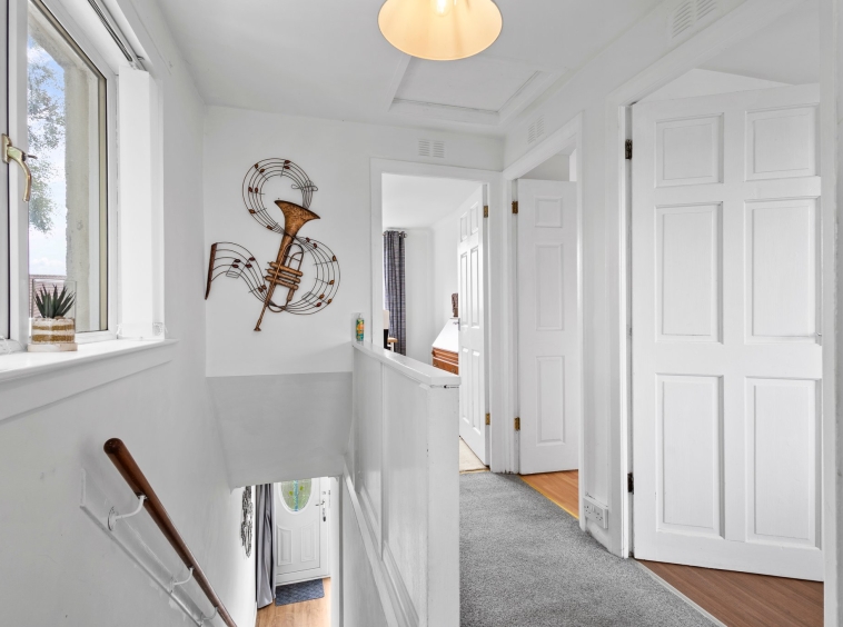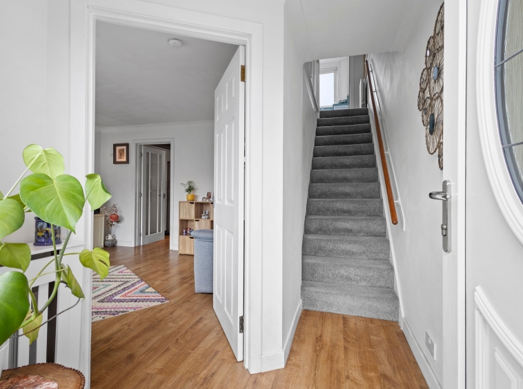 1.85m x 1.65m (6′ 1″ x 5′ 5″) The welcoming entrance hallway offers neutral decor with laminate flooring, door access to lounge and carpeted staircase leading to the upper level.