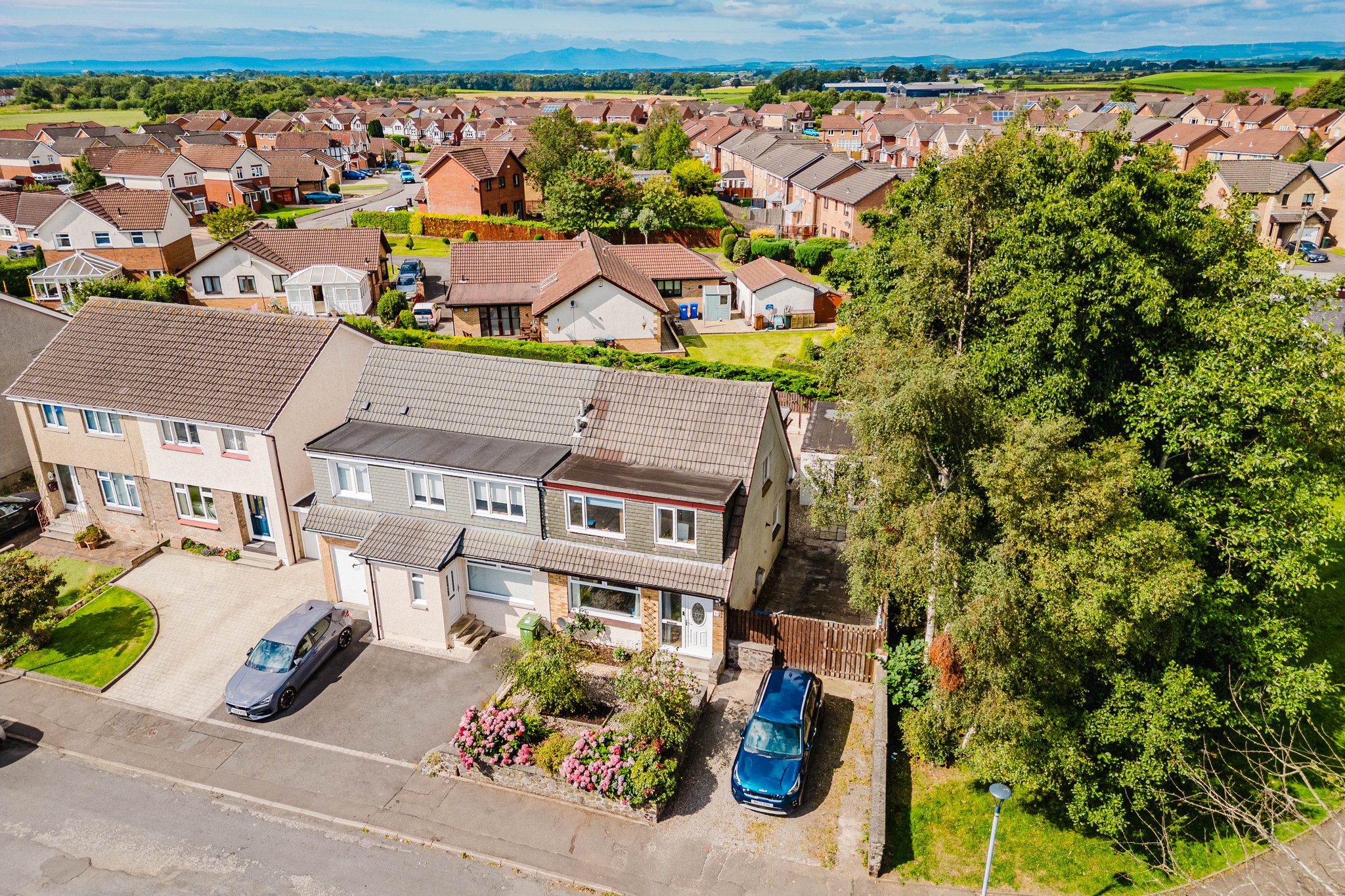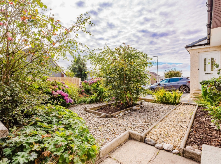Positioned on a generous plot, this family home boasts private garden grounds to the front and rear. The front gardens are laid to decorative chips with a lovely selection of colourful shrubbery and a driveway to the side providing ample off street parking. The rear gardens are laid to chips with a paved patio and access into the detached garage.
