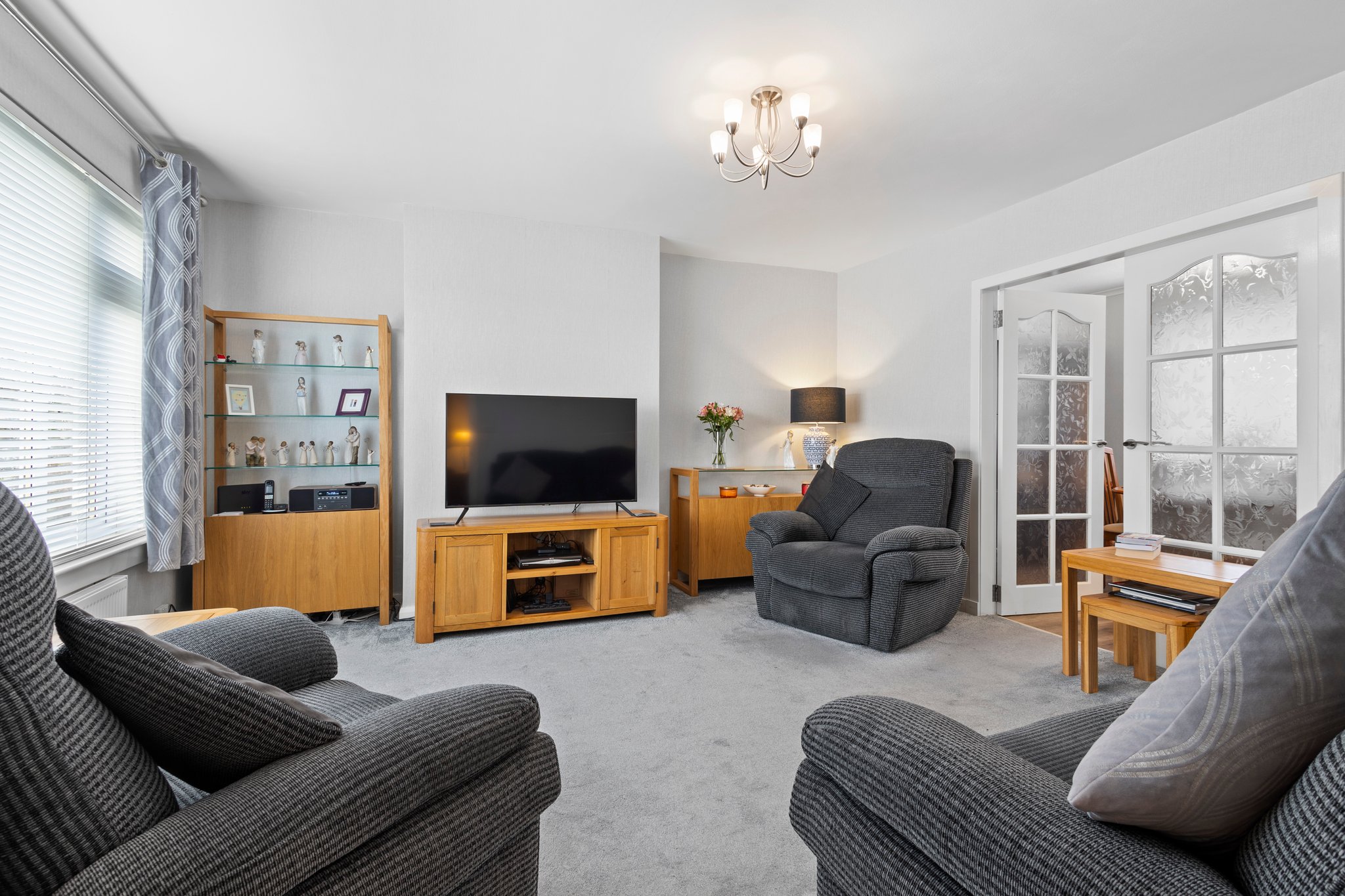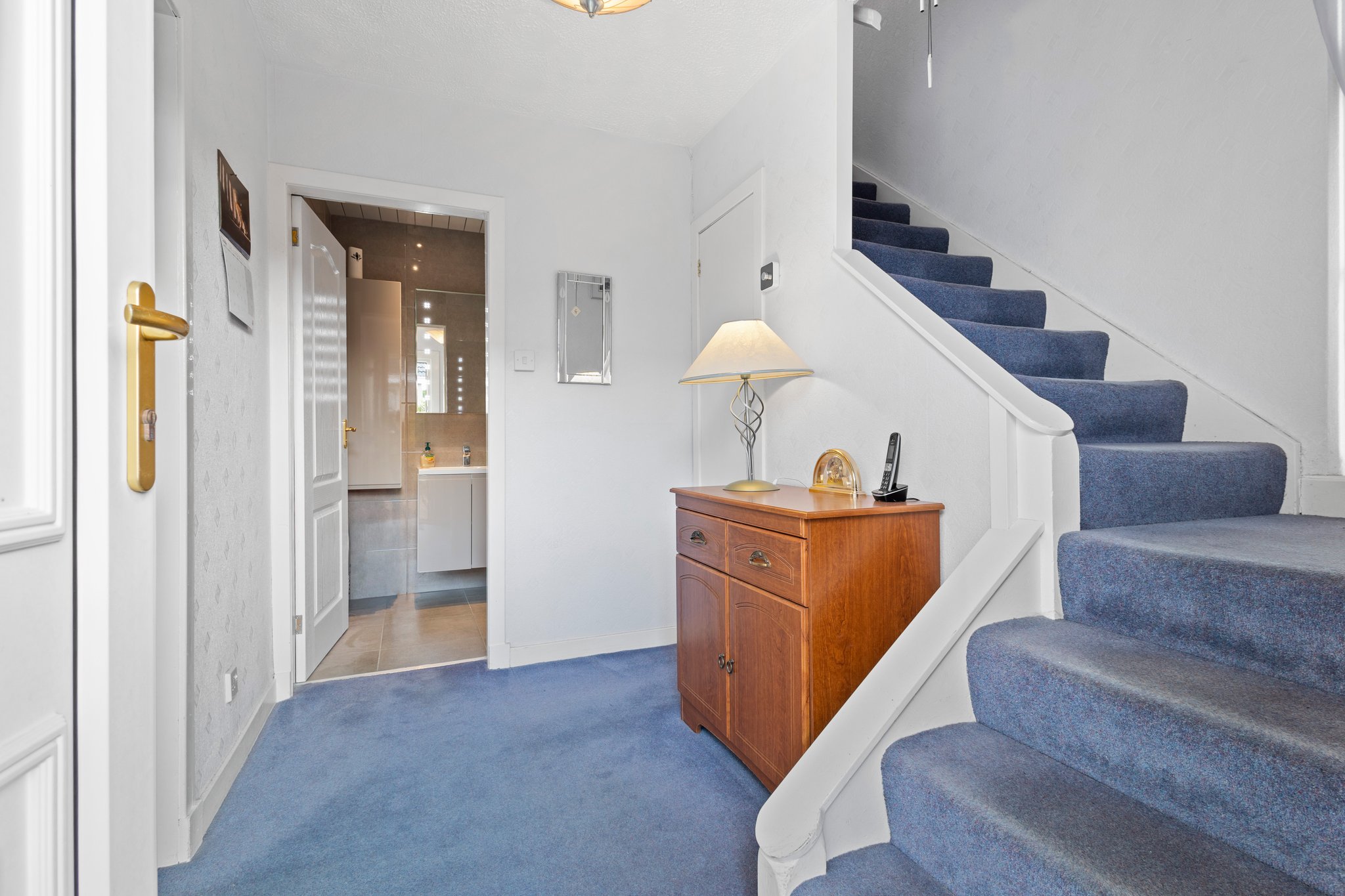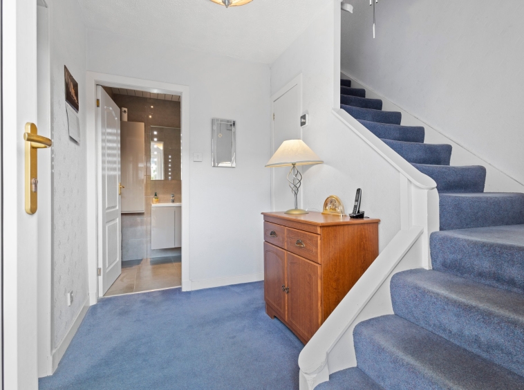 2.61m x 1.79m (8′ 7″ x 5′ 10″) Access is given to a spacious welcoming hallway boasting neutral decor, practical storage cupboard, fitted carpet and a double glazed window to the side. The hallway gives access to the lounge and shower room.