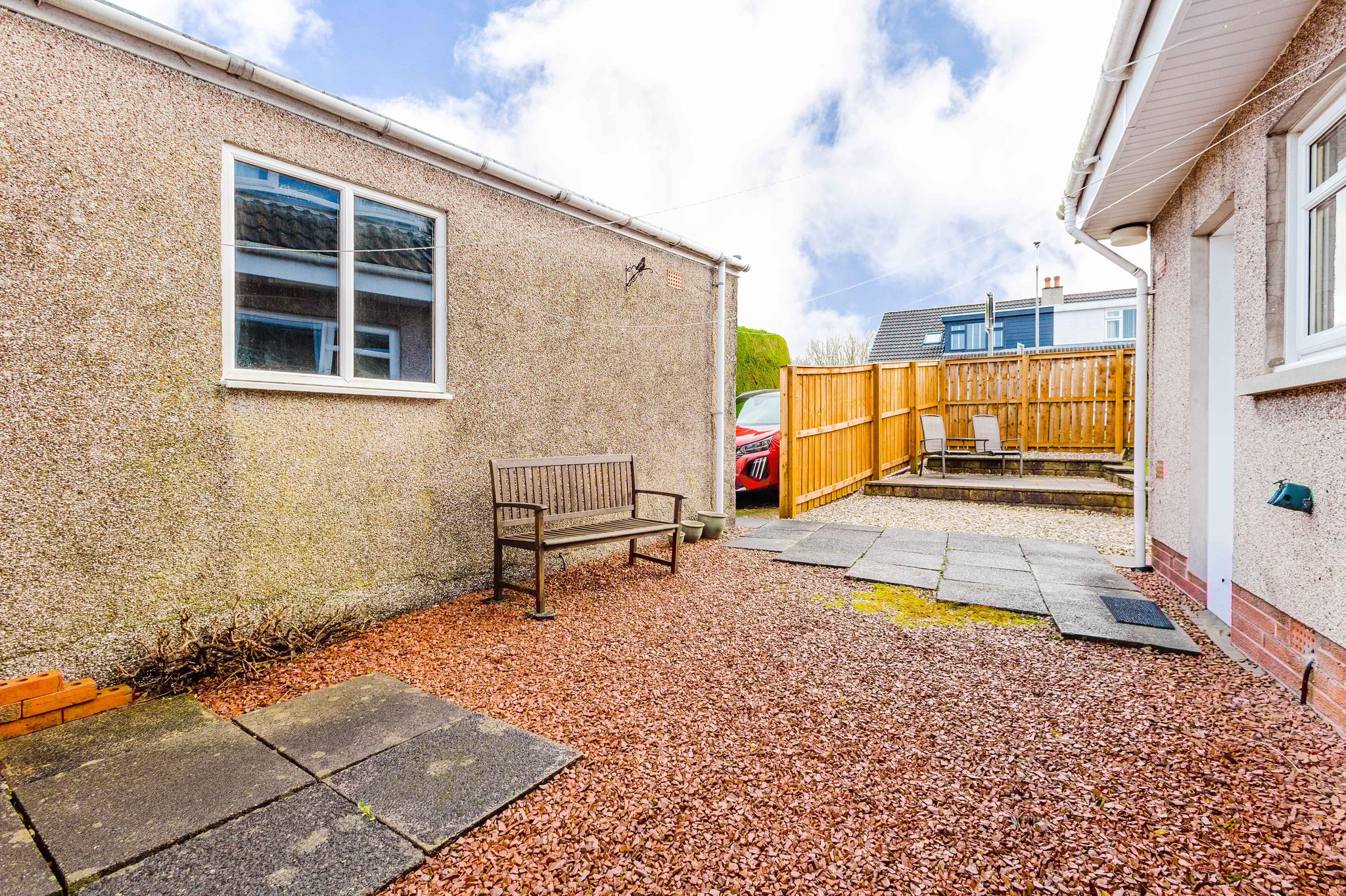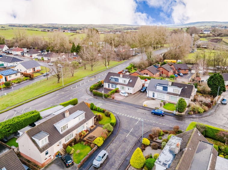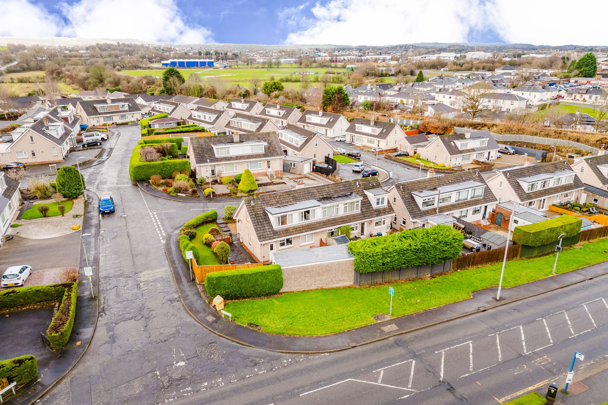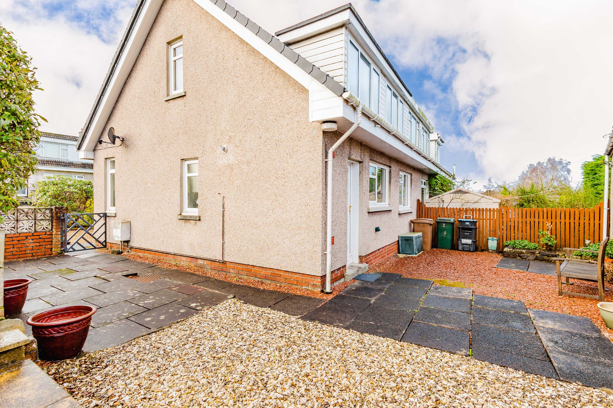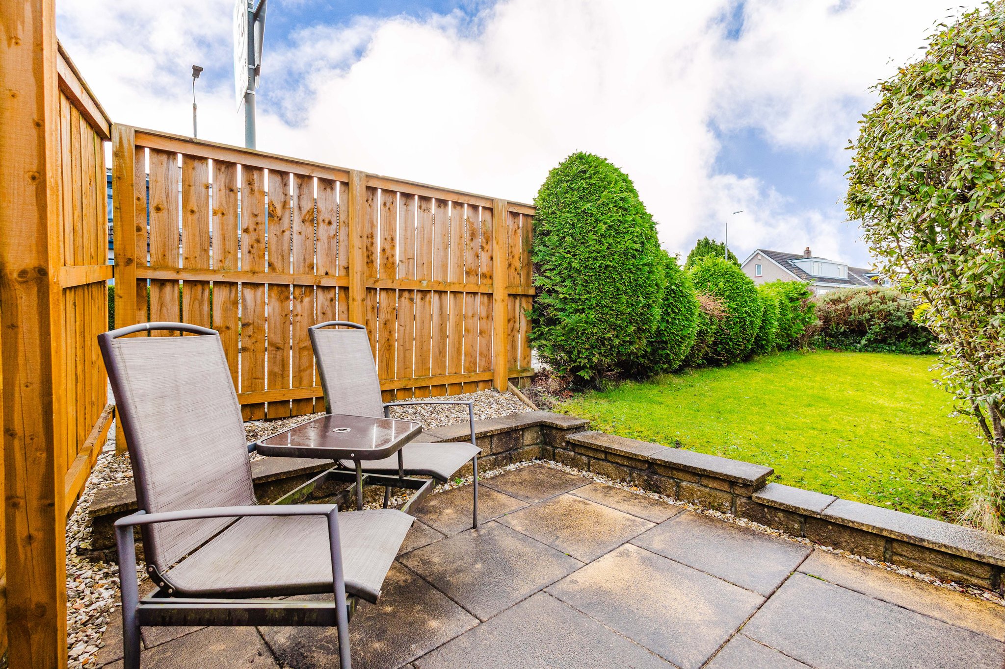 Positioned on a generous corner plot, this family villa boasts wraparound gardens to the front, side and rear. Private driveway to the side providing off street parking, leading to the detached garage with up and over door access. The front gardens are laid to chips with a generous lawn and paved patio to the side, bordered by a selection of hedging and shrubbery. The rear gardens are laid to chips with a fenced border.