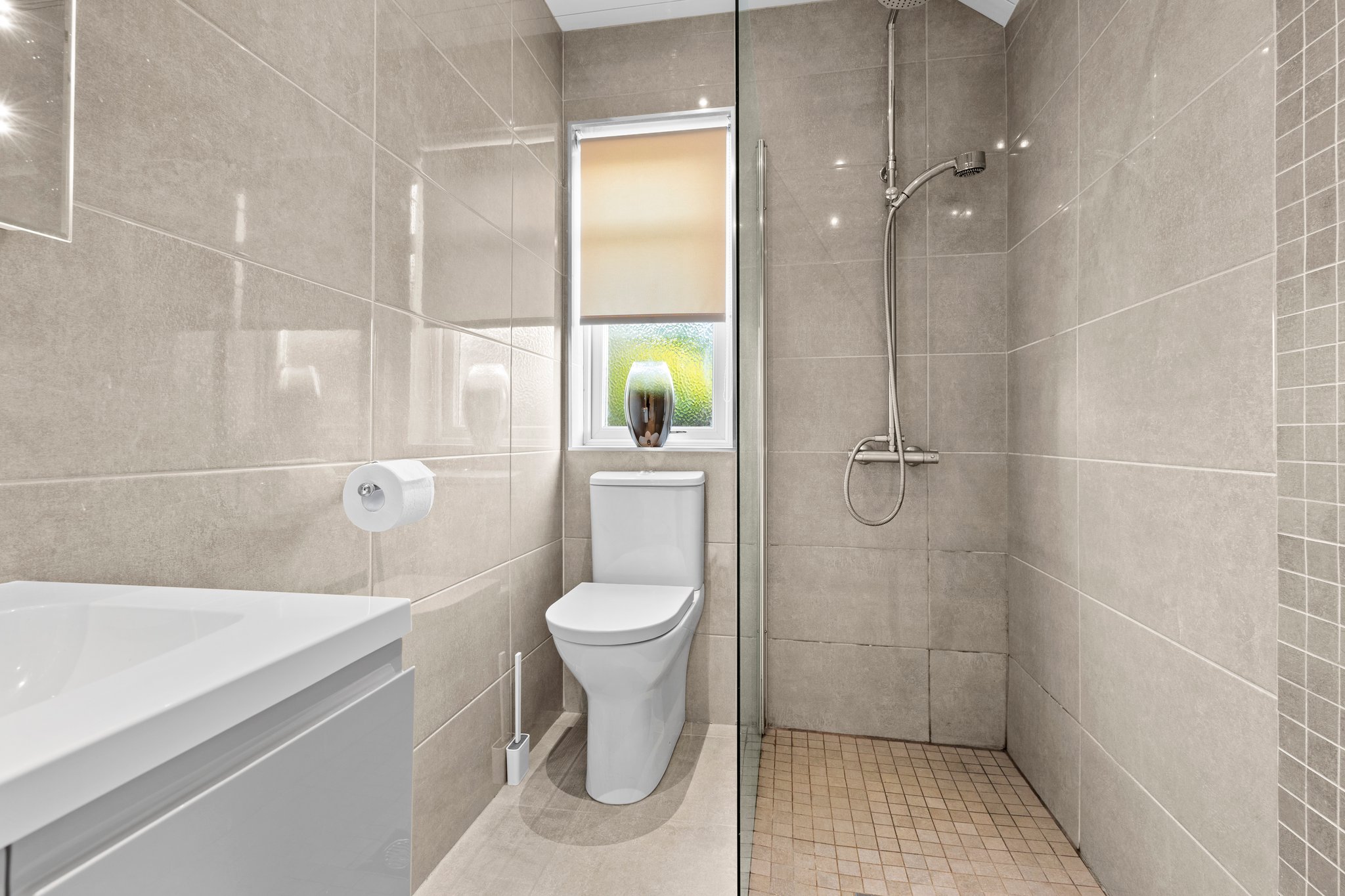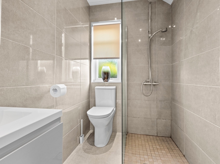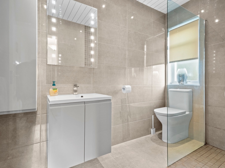 2.81m x 1.48m (9′ 3″ x 4′ 10″) Conveniently located on the lower level the contemporary shower room comprises of a wash hand basin with vanity storage, wc, shower cubicle with mains shower, fully tiled, heated towel rail, ceiling spotlights, fully tiled shower, tiled flooring and a double glazed window to the side.