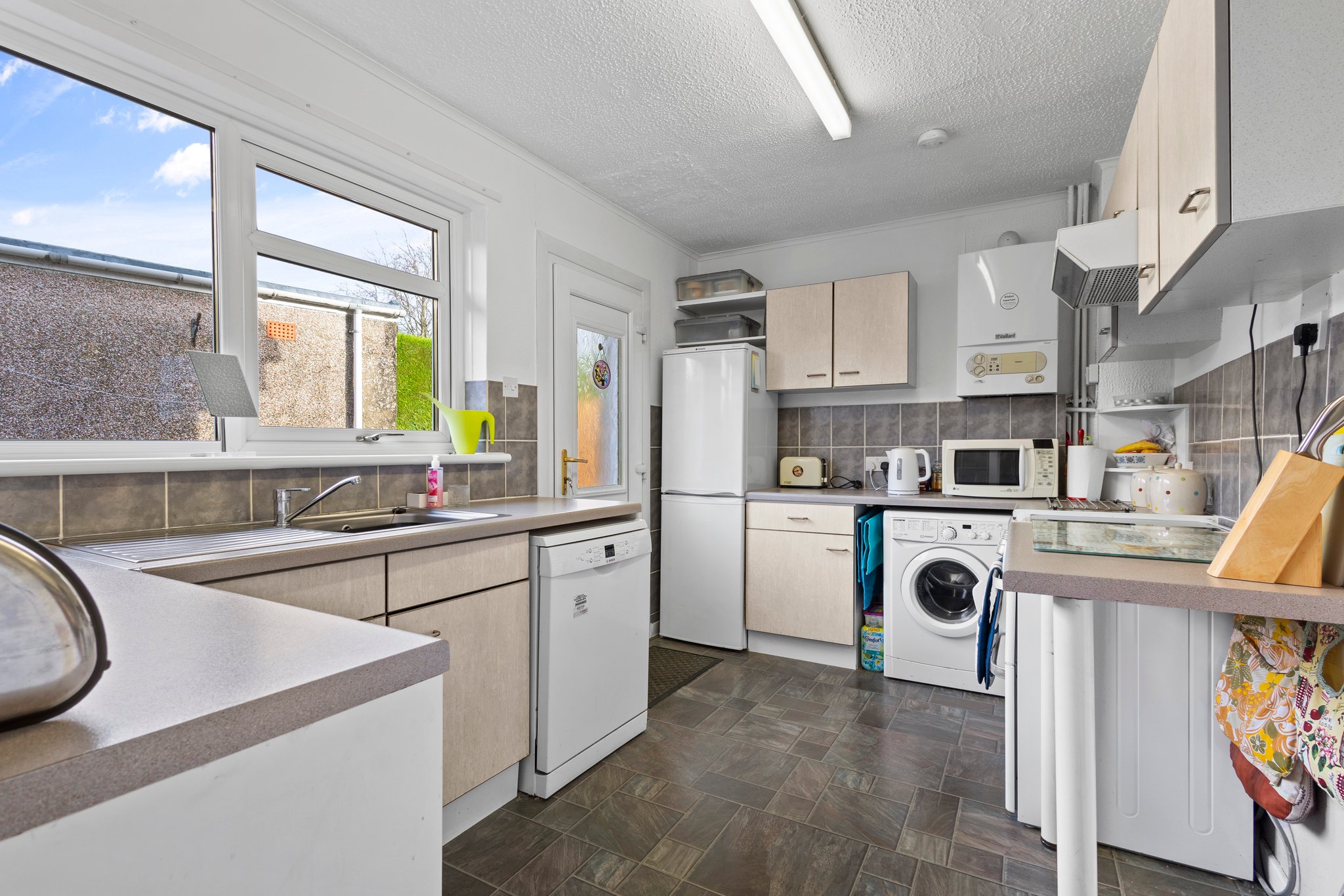 3.89m x 2.50m (12′ 9″ x 8′ 2″) Fully fitted kitchen complete with ample wall and base storage units with complimentary work surface, plumbing and space for a cooker, fridge freezer, dish washer and washing machine, stainless steel sink and drainer, neutral decor, vinyl flooring, a double glazed window to the rear and a door leading to the rear garden.