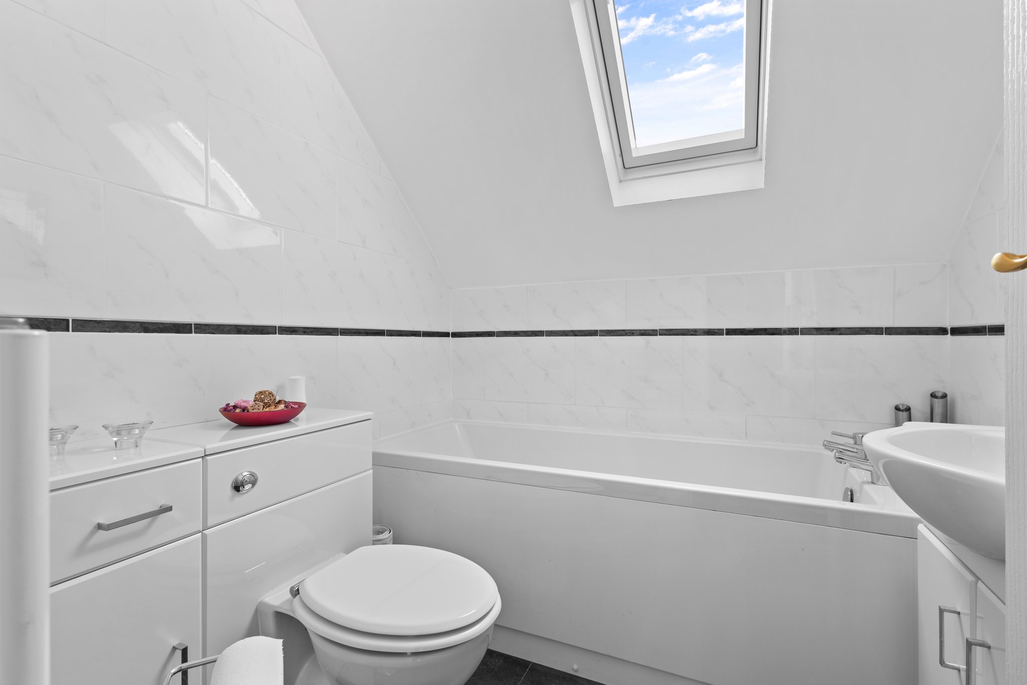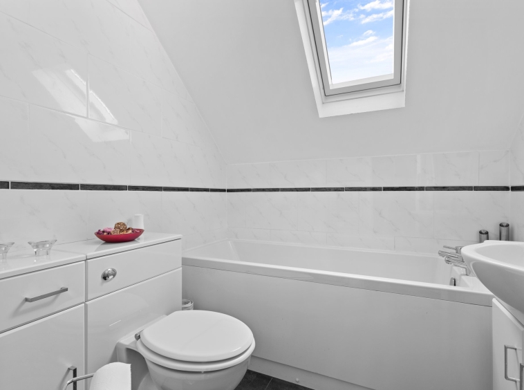 1.97m x 1.95m (6′ 6″ x 6′ 5″) Completing the accommodation is the three piece family bathroom comprising of a wash hand basin and vanity unit, wc, bath, modern tiled finish, vinyl flooring and a double glazed Velux window to the front.