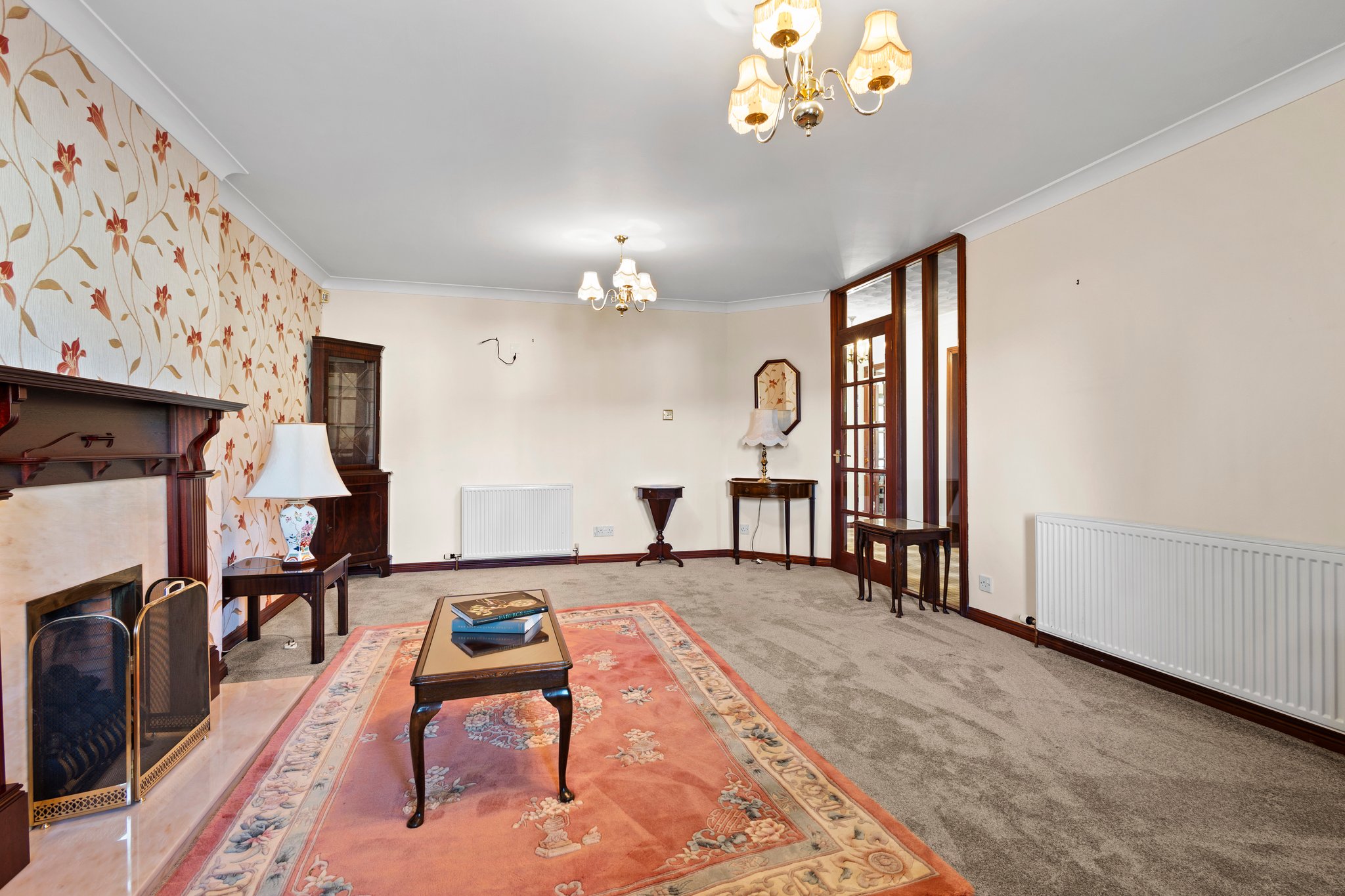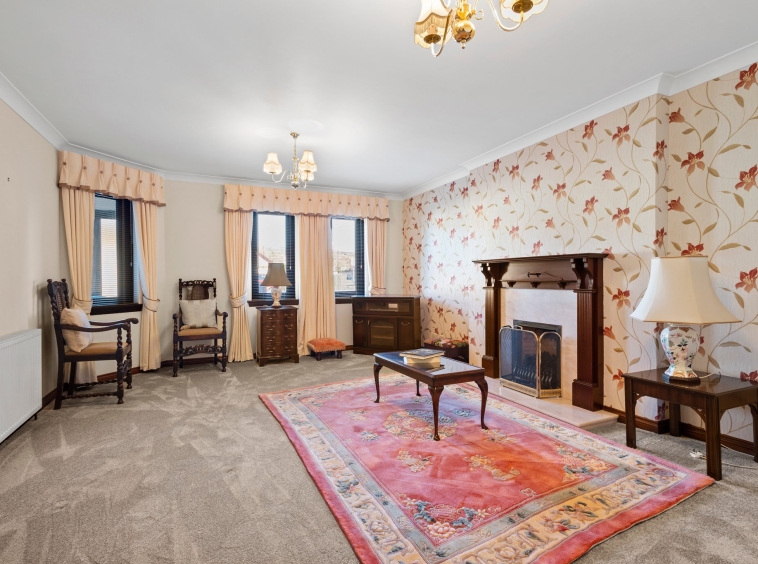4.21m x 5.98m (13′ 10″ x 19′ 7″) Generously proportioned main apartment boasting neutral decor with a stylish feature wall, gas fireplace within a decorative surround, plentiful space for free standing furniture, fitted carpet and a large double glazed window to the front.