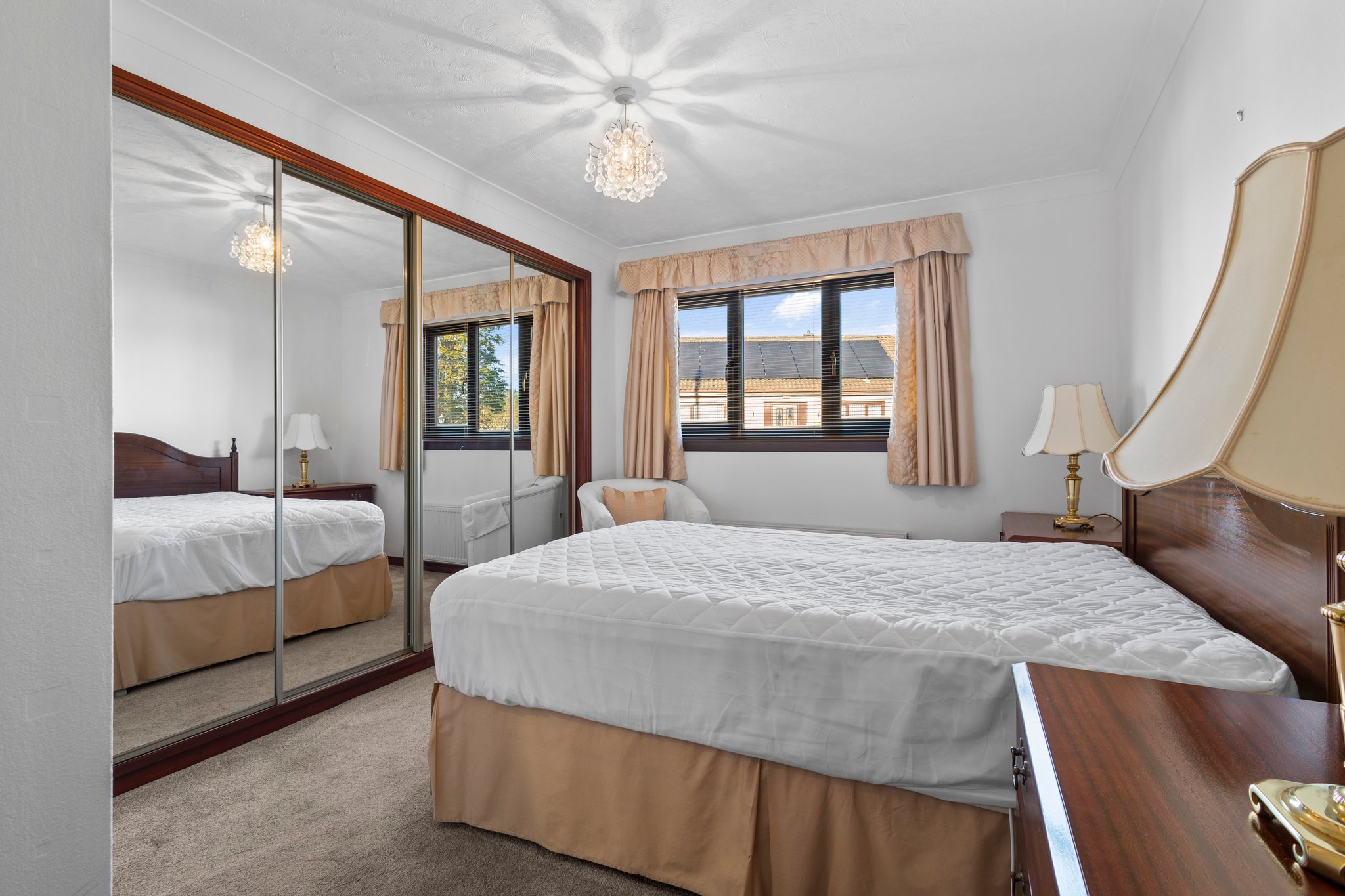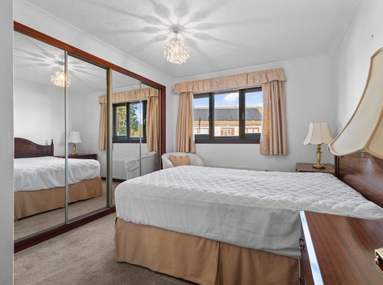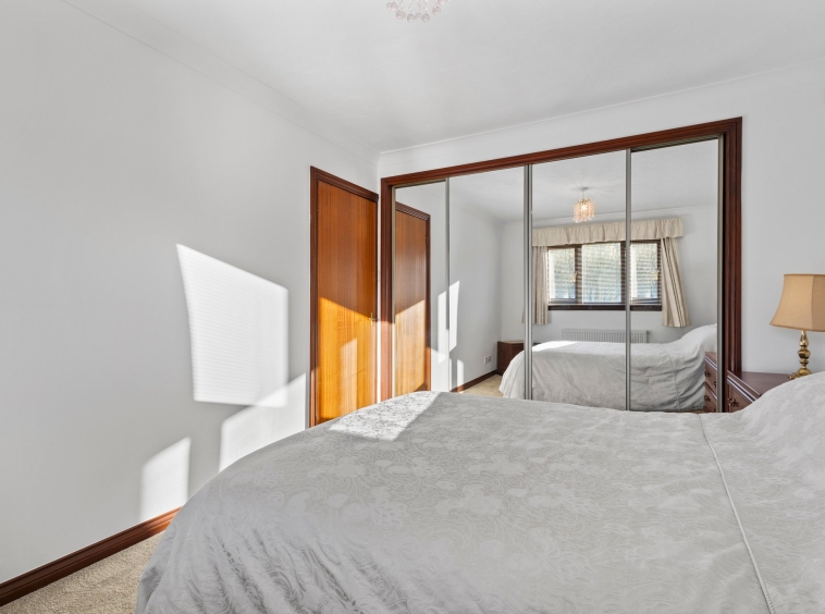 2.96m x 3.73m (9′ 9″ x 12′ 3″) Spacious double bedroom with neutral decor, mirrored door fitted wardrobes, fitted carpet and a double glazed window to the rear.