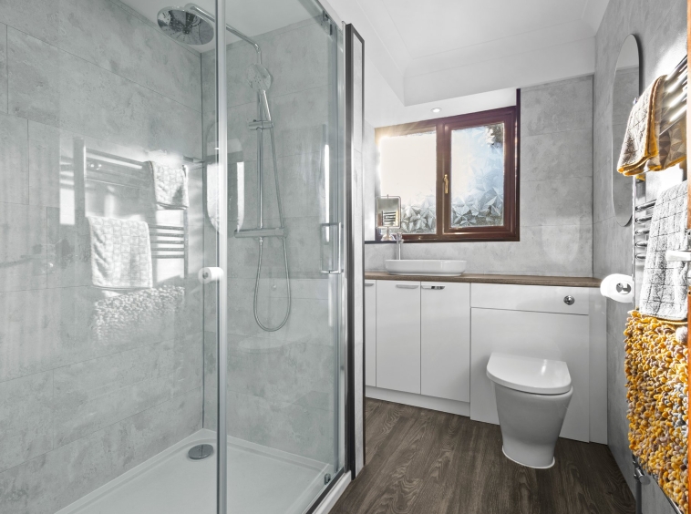 2.68m x 1.77m (8′ 10″ x 5′ 10″) Stylish en-suite comprising of a wash hand basin with vanity storage and wc set, shower cubicle, modern wet wall tiling and LVT flooring.