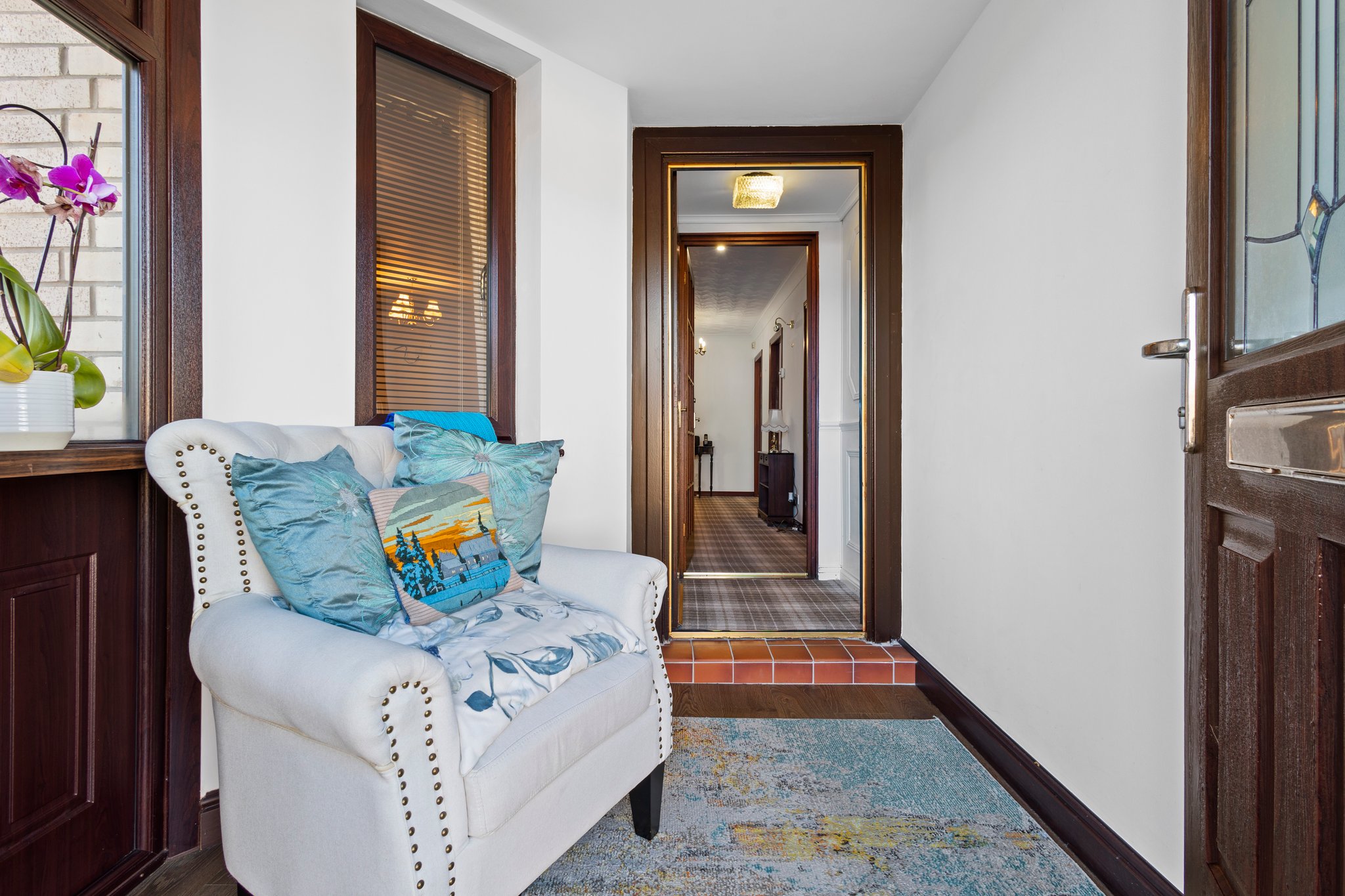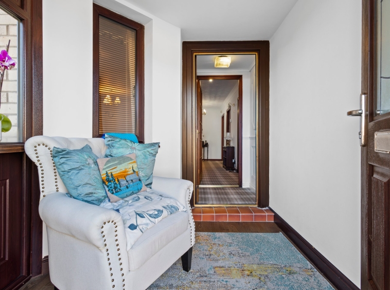 2.30m x 2.34m (7′ 7″ x 7′ 8″) Access is given via an outer door to a welcoming entrance porch boasting neutral decor, laminate flooring, a double glazed window to the side and a door leading to the hallway.