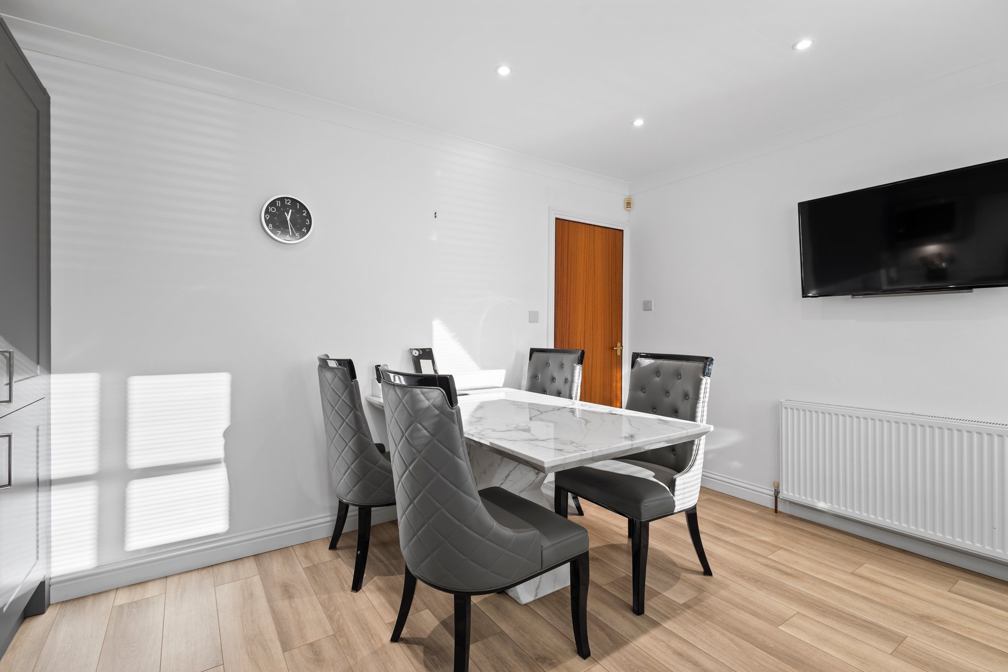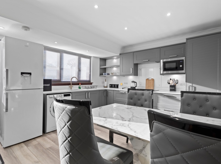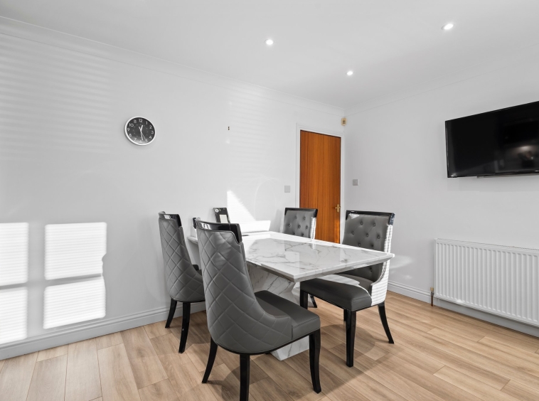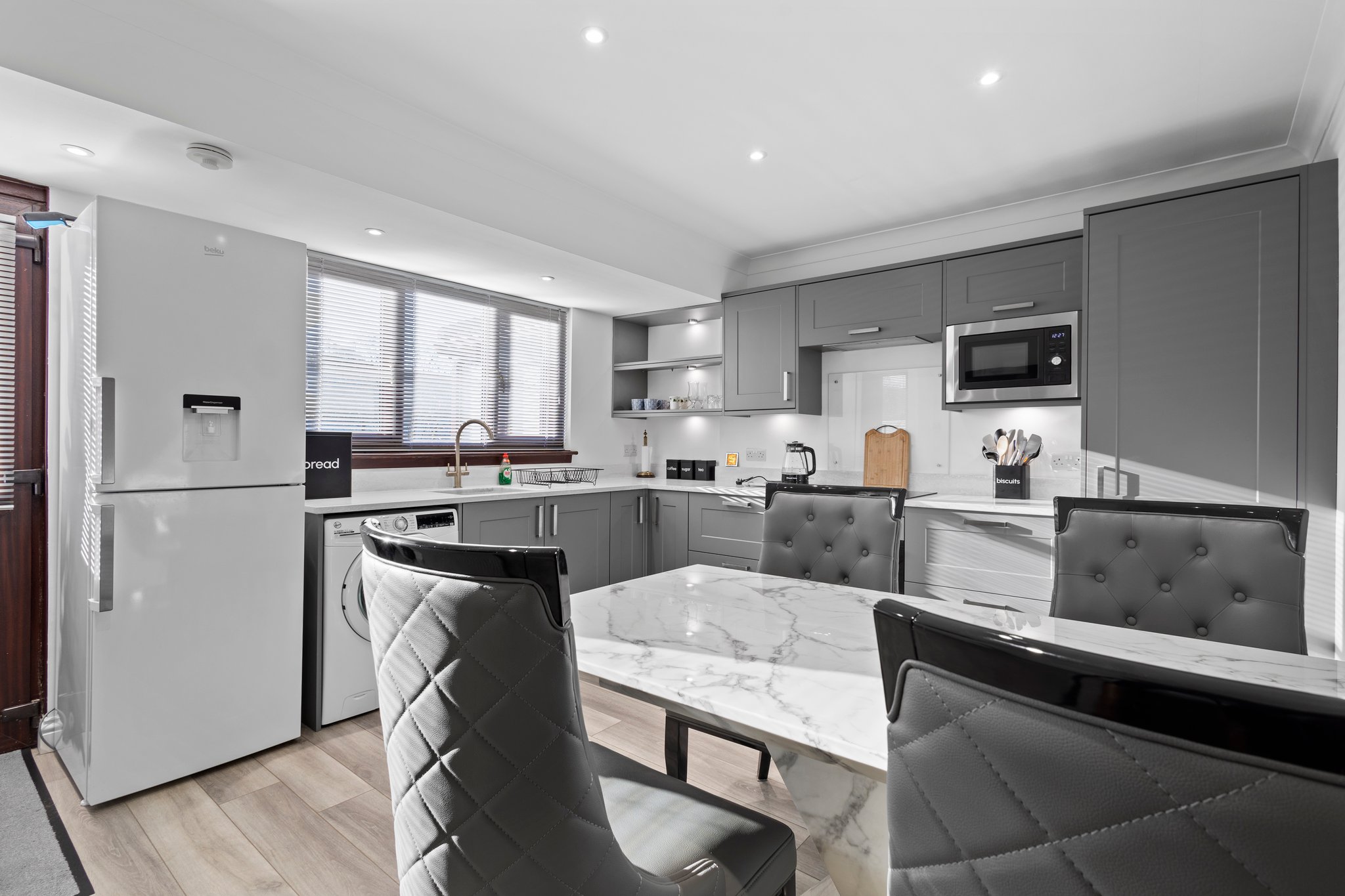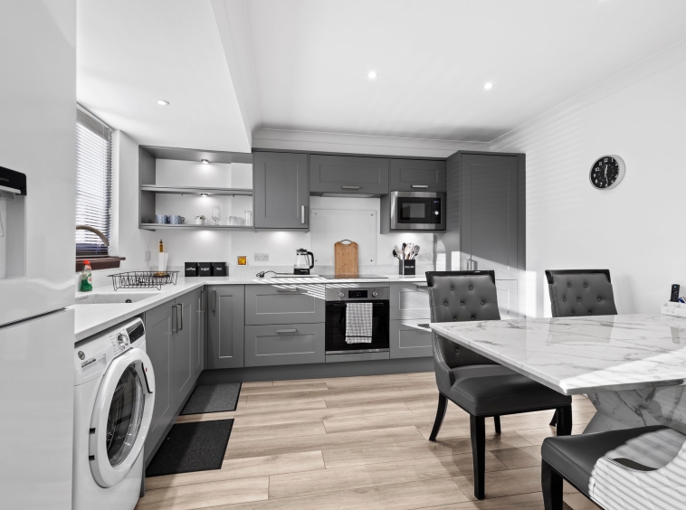 4.19m x 3.70m (13′ 9″ x 12′ 2″) Fully fitted modern kitchen complete with stylish matt grey wall and base units providing ample storage with complimentary marble effect work surface, integrated oven, hob and hood, integrated microwave, plumbing and space for a washing machine, sink and drainer, neutral decor, plentiful space for dining table and chairs LVT flooring, a large double glazed window to the rear and a door leading to the rear garden.