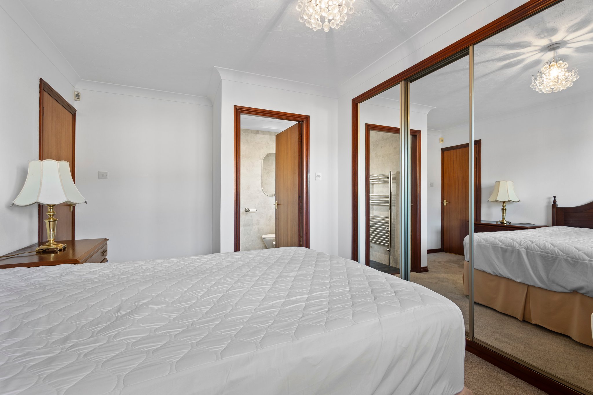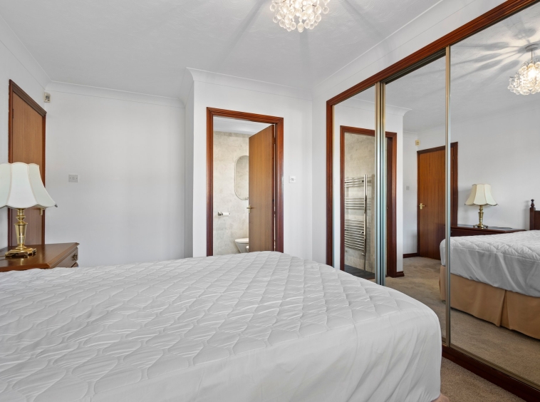 2.84m x 4.34m (9′ 4″ x 14′ 3″) The master bedroom is an impressive double boasting neutral decor, quadruple mirrored door fitted wardrobes providing ample storage, fitted carpet, a double glazed window to the front and access to en-suite facilities.