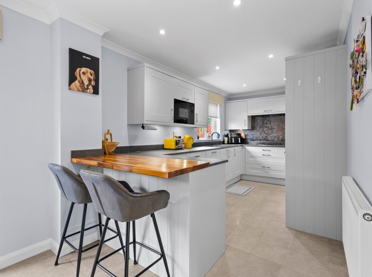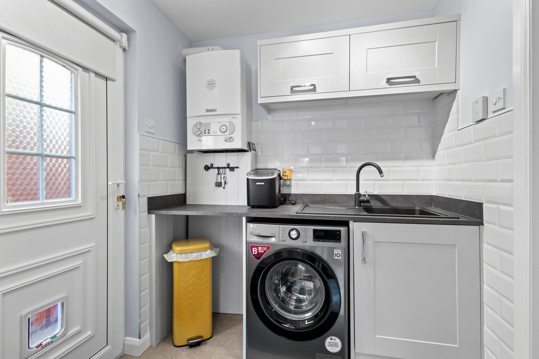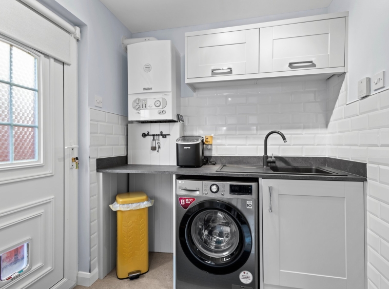 1.92m x 1.68m (6′ 4″ x 5′ 6″) Practical separate utility room offering additional storage units with complementary work surfaces, composite sink and drainer, plumbing/space for washing machine, neutral decor with metro style tiled splashback and vinyl tile flooring. Door access to cloaks/wc and UPVC door leading out into the gardens.