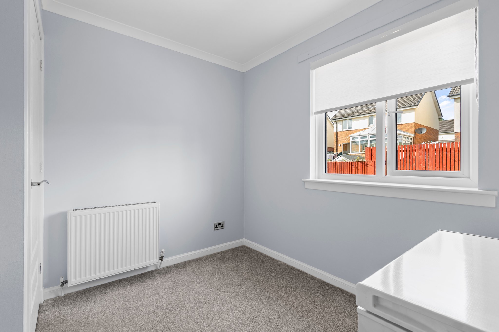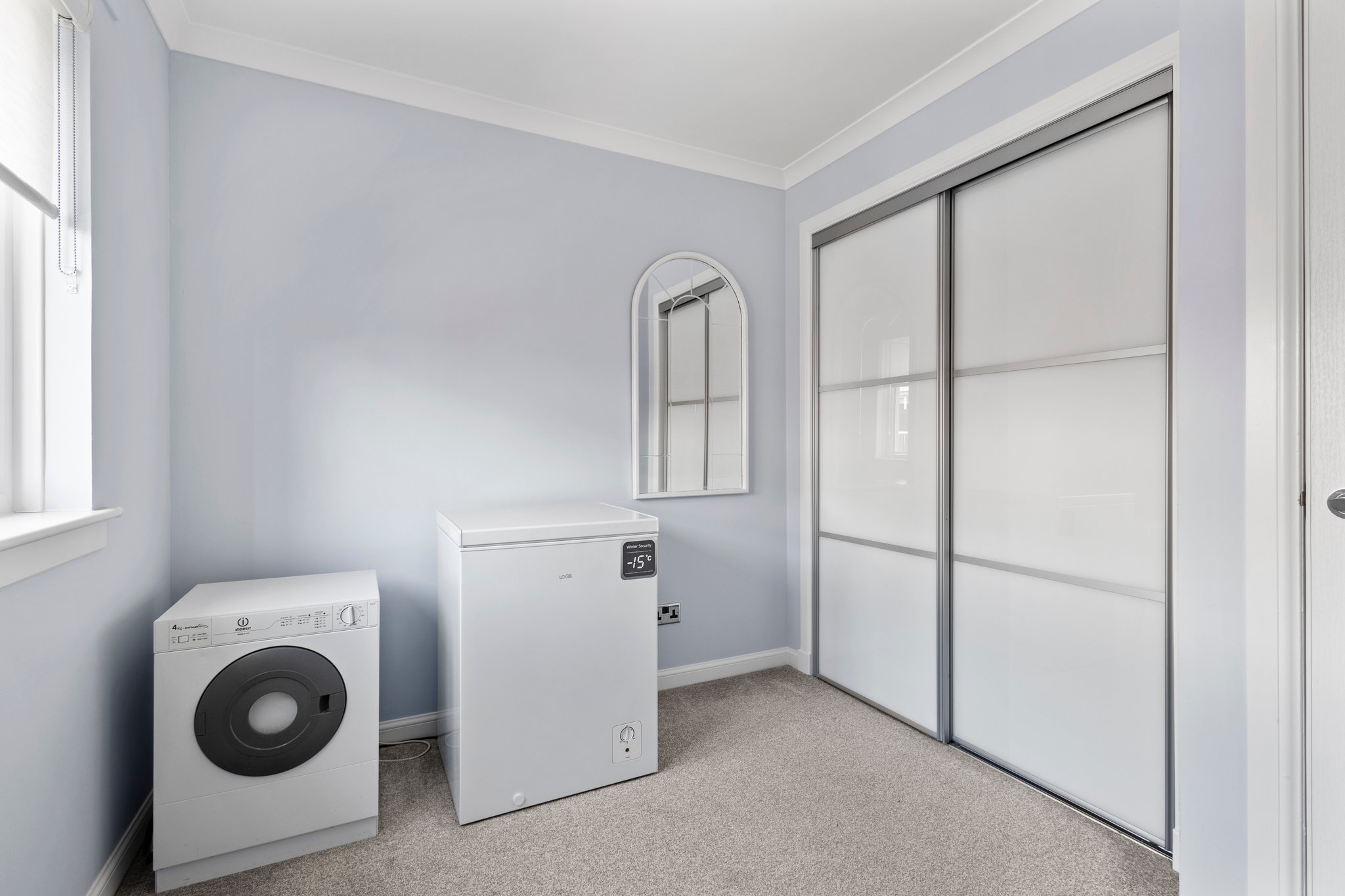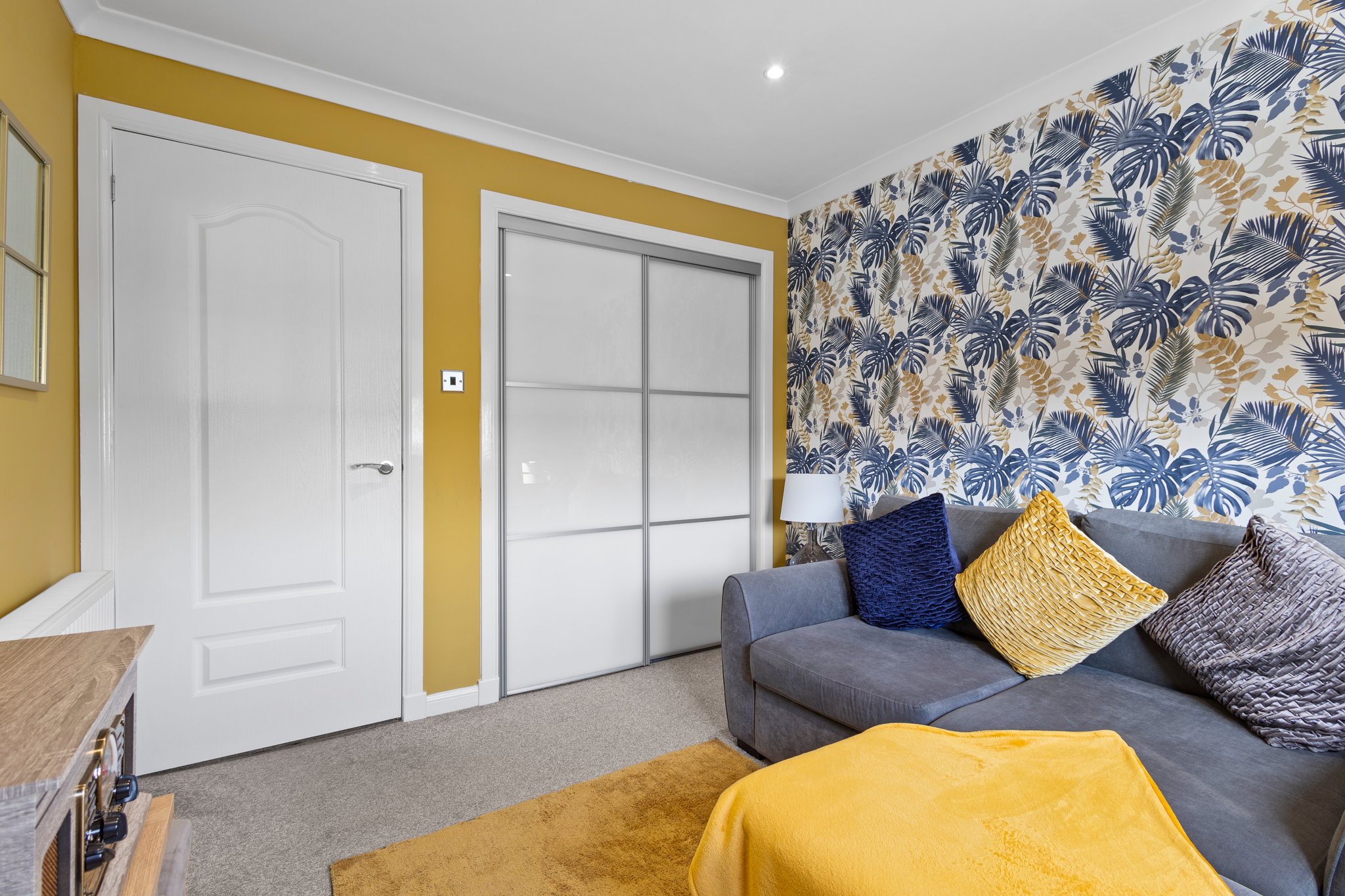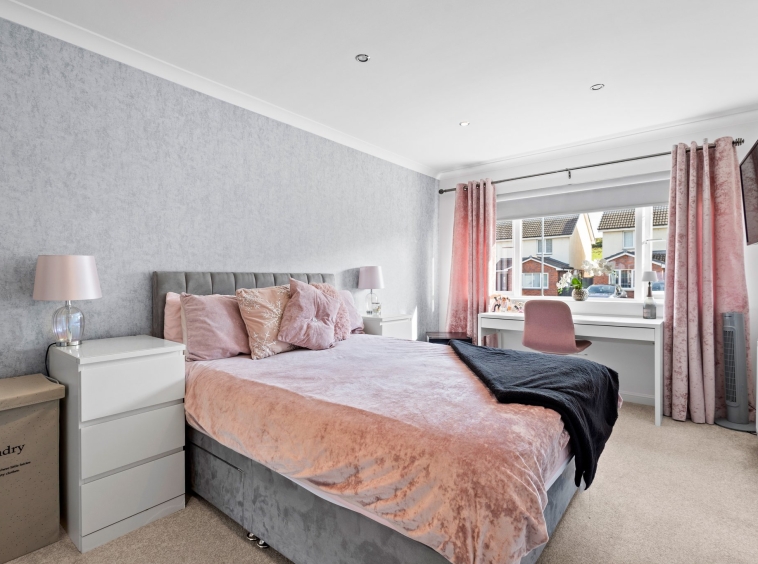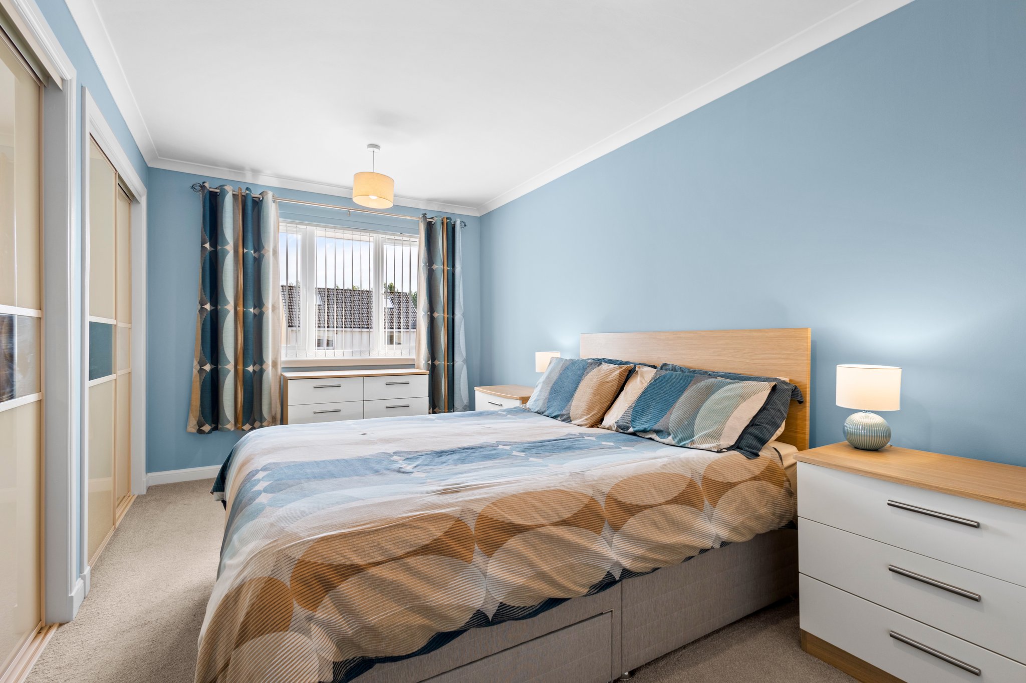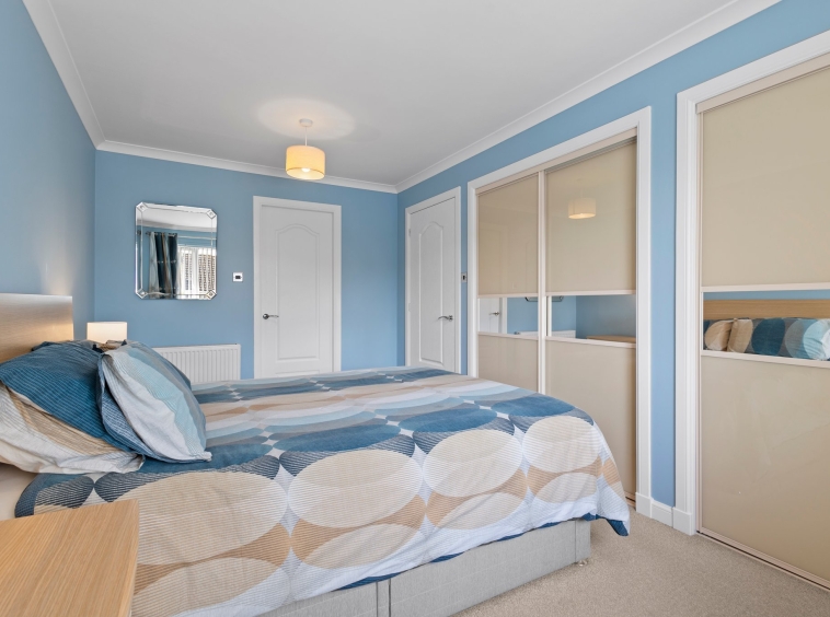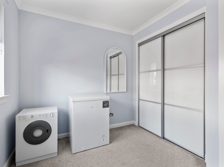 3.02m x 2.90m (9′ 11″ x 9′ 6″) The second double bedroom offers modern decor with ceiling coving and fitted carpet. Double door fitted wardrobe, storage cupboard and double glazed window to the front.