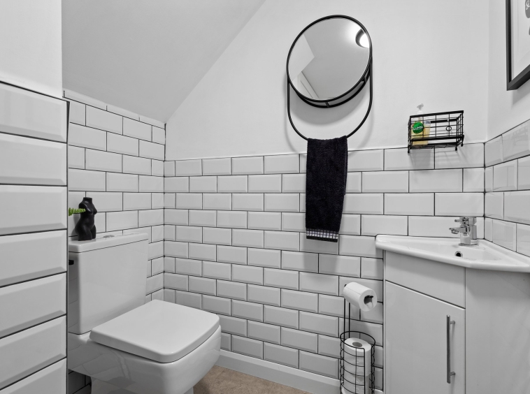 1.97m x 1.68m (6′ 6″ x 5′ 6″) Stylish two piece cloaks/wc comprising of a wash hand basin with vanity storage and wc, half height metro tiling to walls, vinyl tile flooring and crisp white decor.