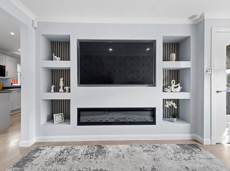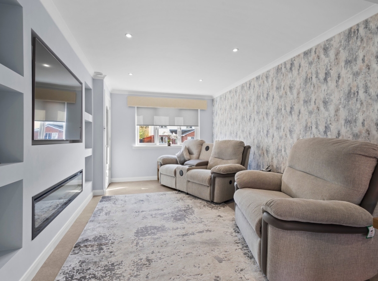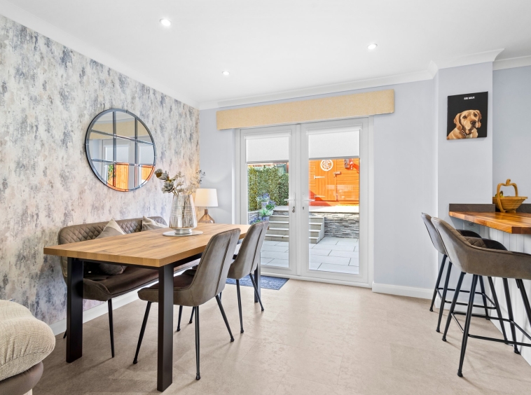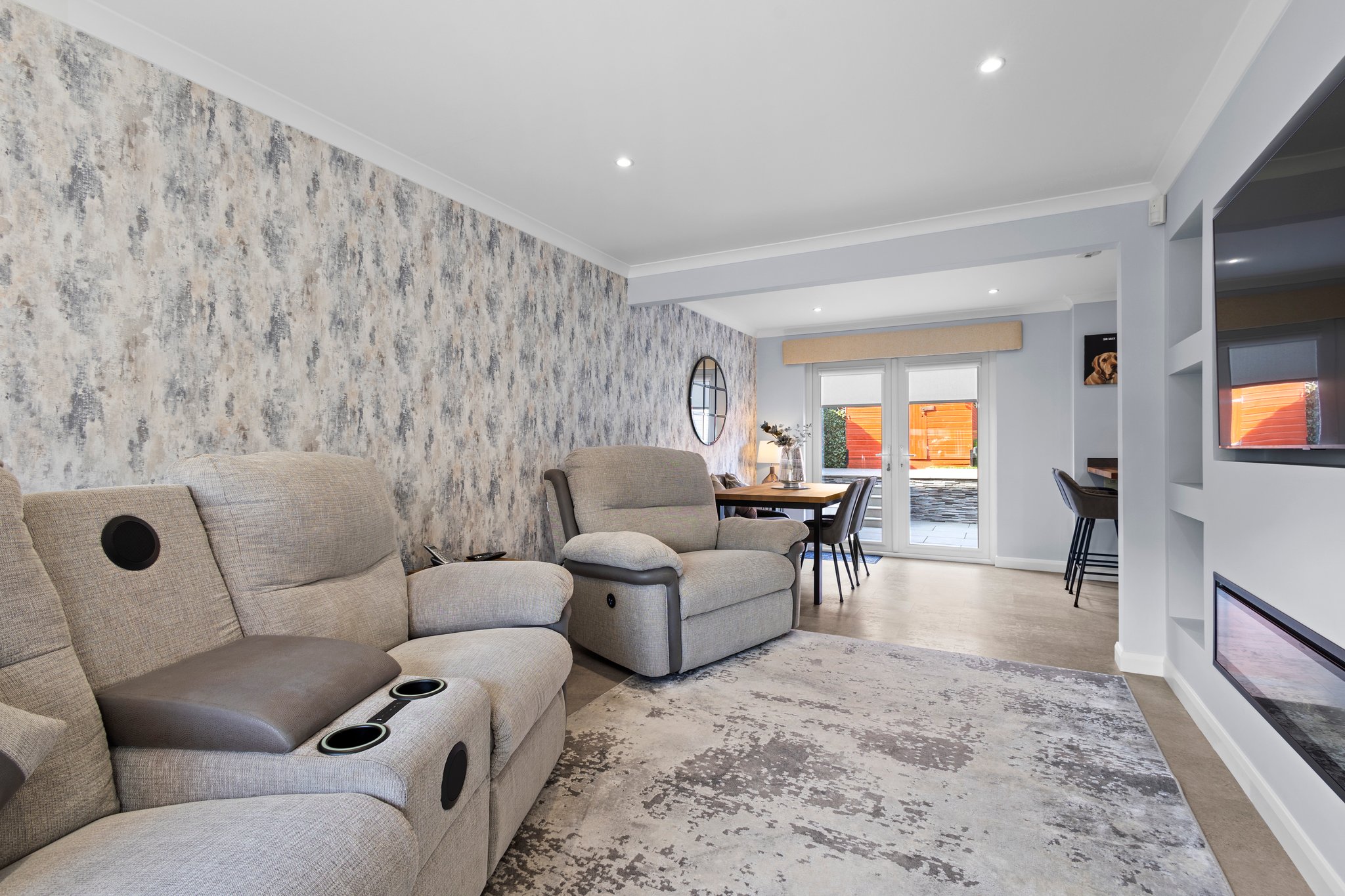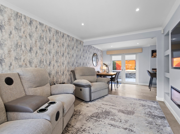 3.40m x 6.89m (11′ 2″ x 22′ 7″) The formal lounge is a generously proportioned main apartment with an open plan layout to dining area and kitchen, comprising of a contemporary feature media wall with living flame fireplace, modern decor, ceiling coving and vinyl tile flooring. Double glazed window to the front, double glazed French doors leading out into the rear gardens and plentiful space for dining table and chairs, open access to kitchen.