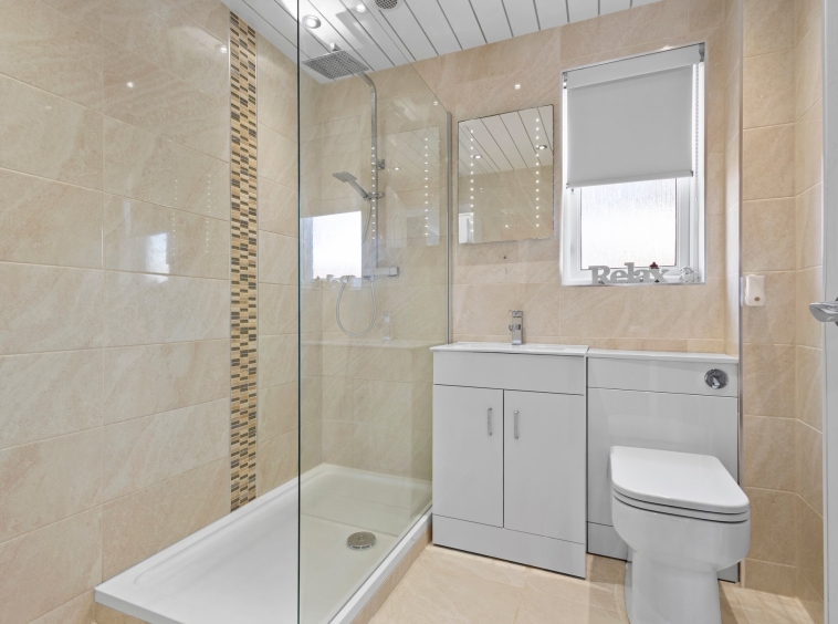 2.06m x 1.95m (6′ 9″ x 6′ 5″) Three bed master en suite shower room comprising of a wash hand basin with vanity storage, wc and double shower cubicle with mains overhead shower. Modern fully tiled walls and floor, heated towel rail, wet room ceiling with spotlights and front facing double glazed opaque window.