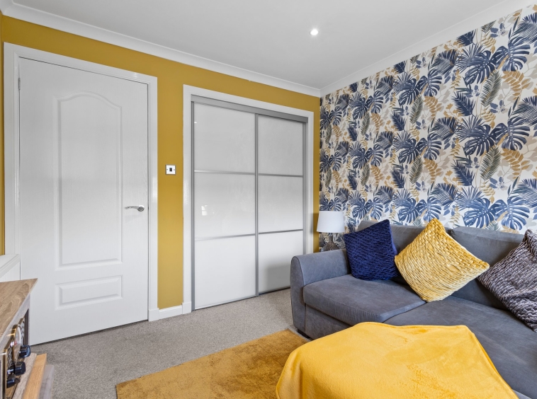4.54m x 2.90m (14′ 11″ x 9′ 6″) Conveniently positioned on the ground floor, this double bedroom is a flexible apartment which could be utilised as a family/sitting room if required. Offering modern decor, ceiling coving, fitted carpet and triple door fitted wardrobes. Double glazed window to the front.