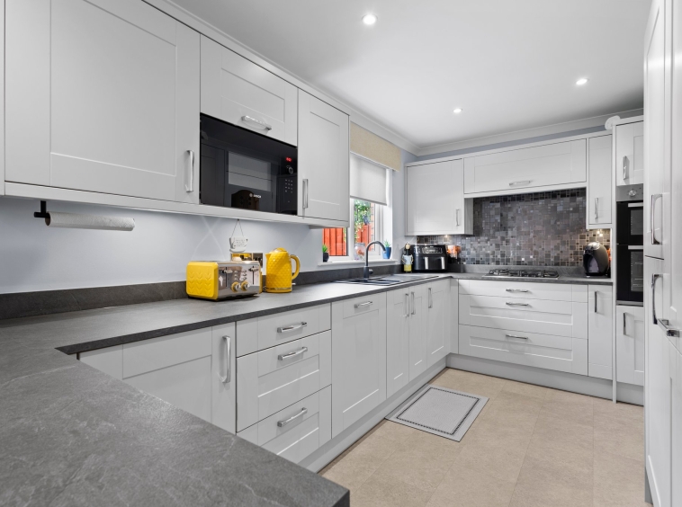 4.59m x 2.50m (15′ 1″ x 8′ 2″) The contemporary breakfasting kitchen is complete with a wide range of grey shaker style wall and base storage units with complementary work surfaces, composite sink and drainer, integrated appliances including oven/grill, gas hob and fridge/freezer. Tasteful neutral decor, vinyl tile flooring, ceiling spotlights and breakfast bar seating area. Door access to utility, open plan to lounge/dining and double glazed window to the rear.