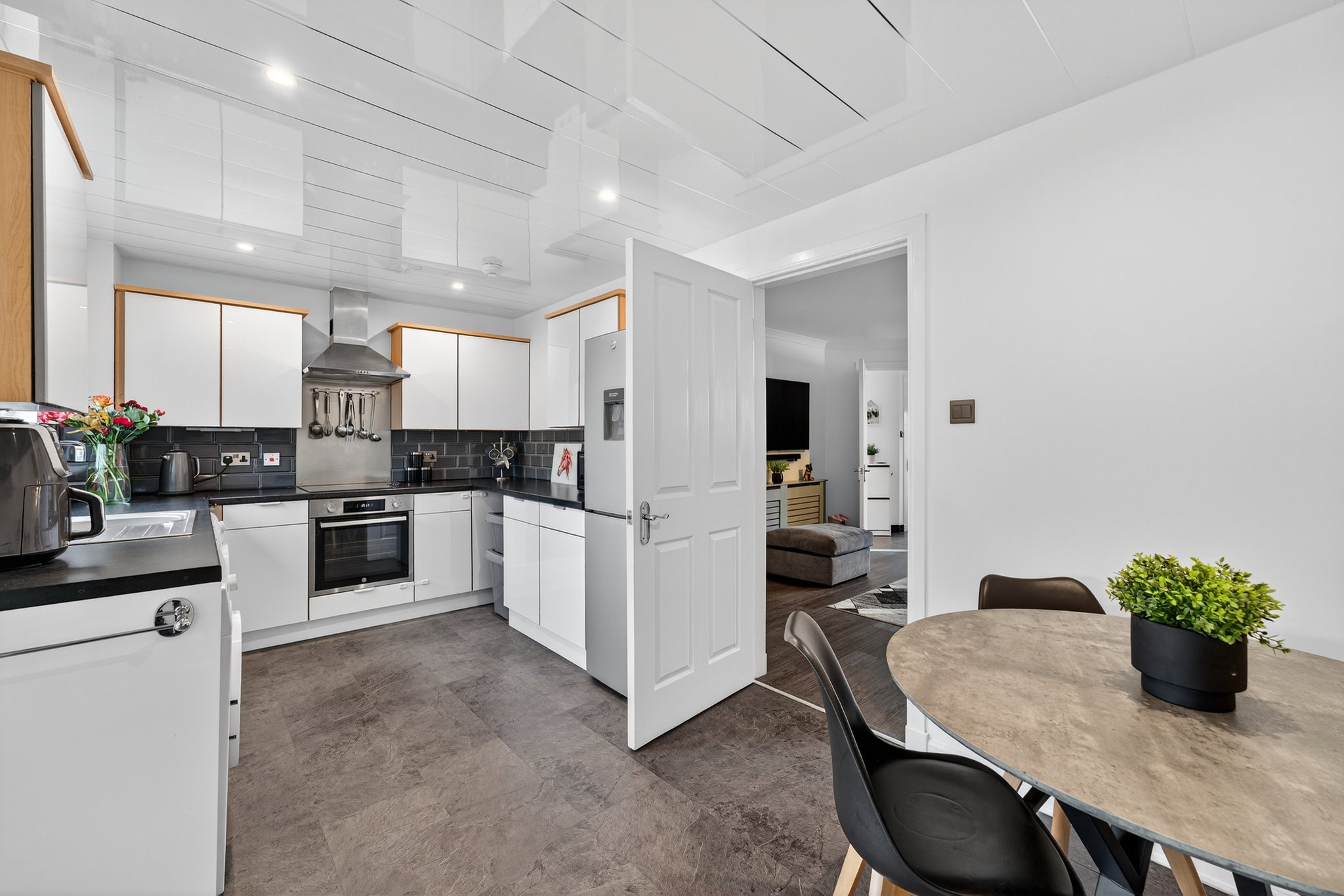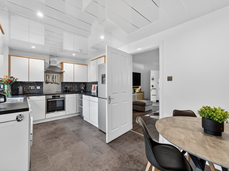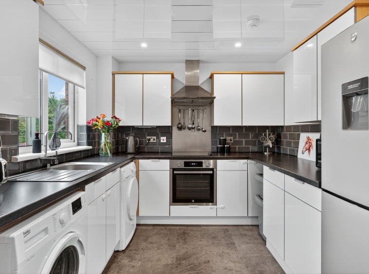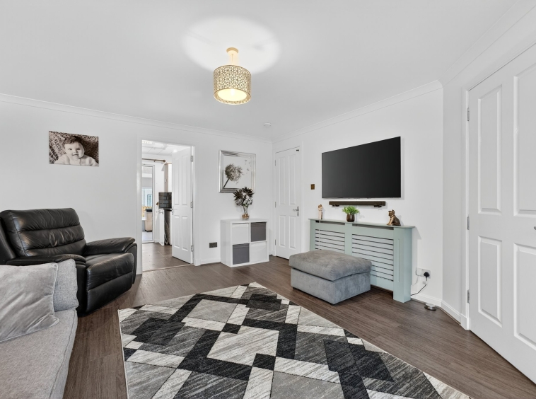4.87m x 4.01m (16′ 0″ x 13′ 2″) Generously proportioned main apartment offering modern decor, ceiling coving, practical storage cupboard, vinyl flooring and a double glazed window to the front.