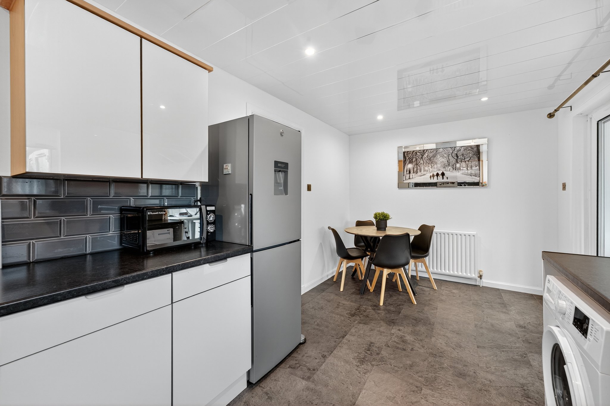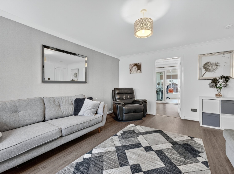 2.71m x 5.11m (8′ 11″ x 16′ 9″) Fully fitted dining sized kitchen complete with white gloss wall and base units providing ample storage with complimentary work surface, integrated oven, electric hob, stainless steel sink and drainer, plumbing and space for washing machine and tumble drier, neutral decor, ceiling spotlights, plentiful space for dining table and chairs, vinyl flooring, a double glazed window to the rear and double door access to the conservatory.
