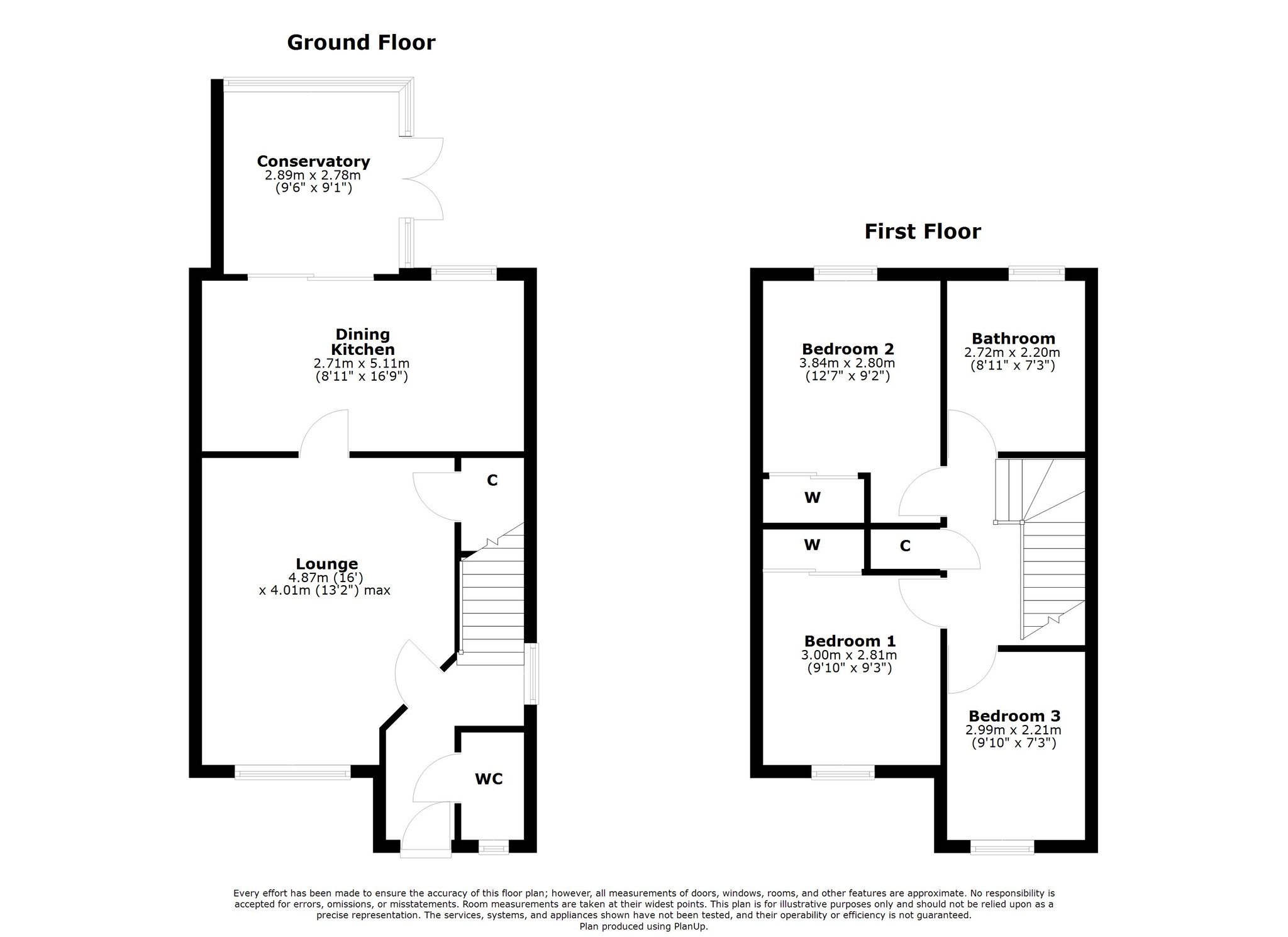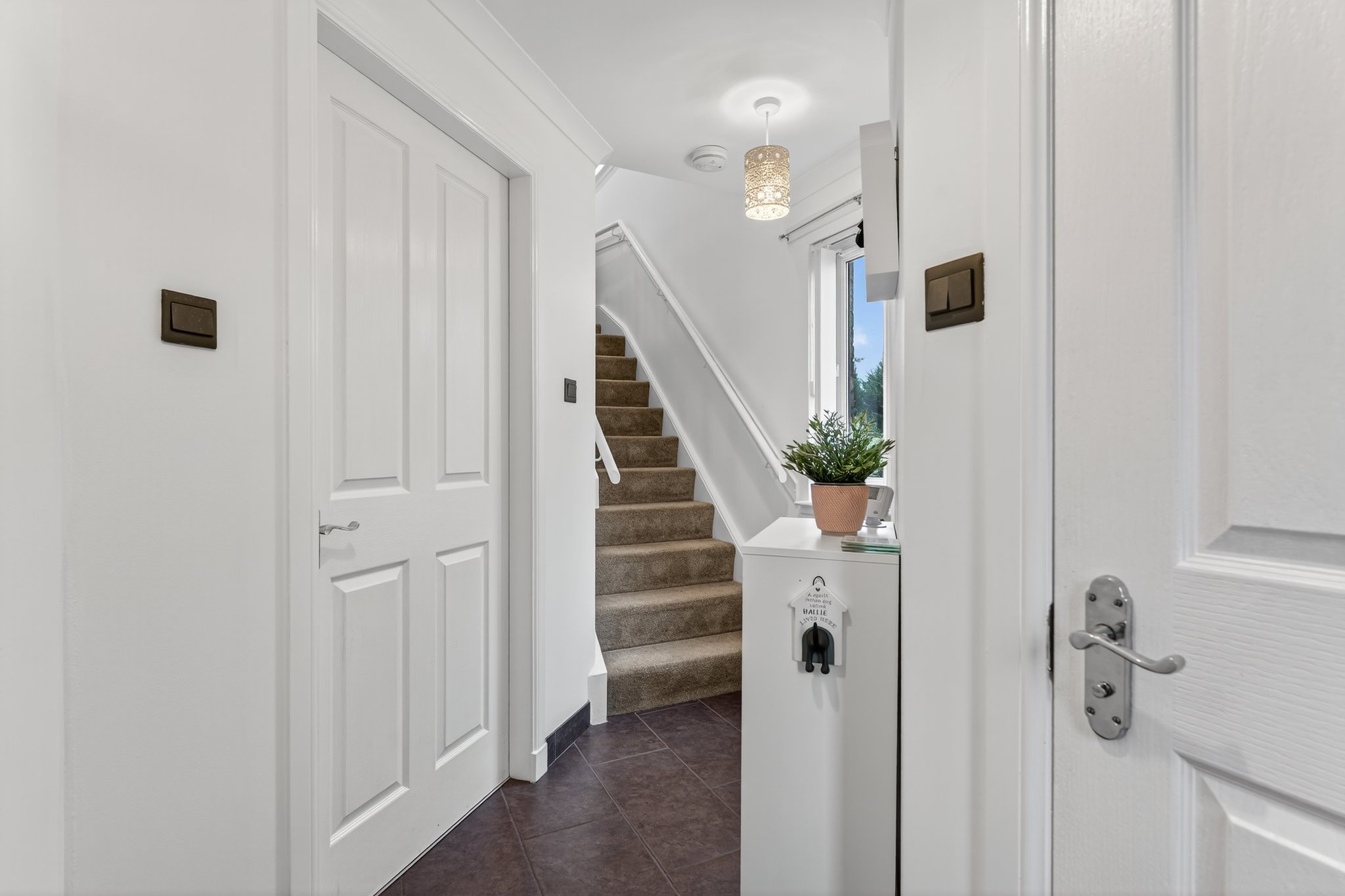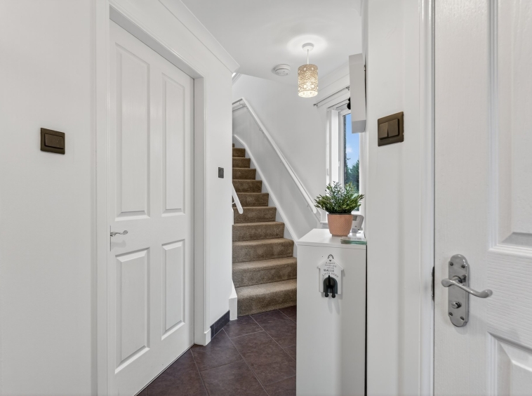2.88m x 2.22m (9′ 5″ x 7′ 3″) Access is given to a welcoming entrance hallway boasting modern neutral decor, ceiling coving, tiled flooring and a double glazed window to the side. The hallway provides access to the lounge, wc and a carpeted staircase leads to the upper level.