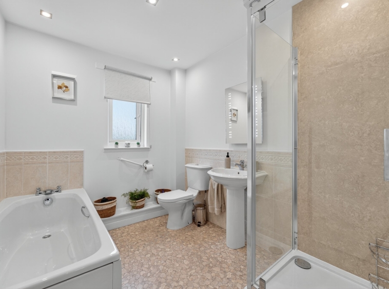 2.72m x 2.20m (8′ 11″ x 7′ 3″) Completing the accommodation is the family bathroom comprising of a wash hand basin, wc, shower cubicle with electric shower, bath, heated towel rail, ceiling spotlight, stylish half height tiling, wet wall finish in shower, vinyl flooring and a double glazed window to the rear.