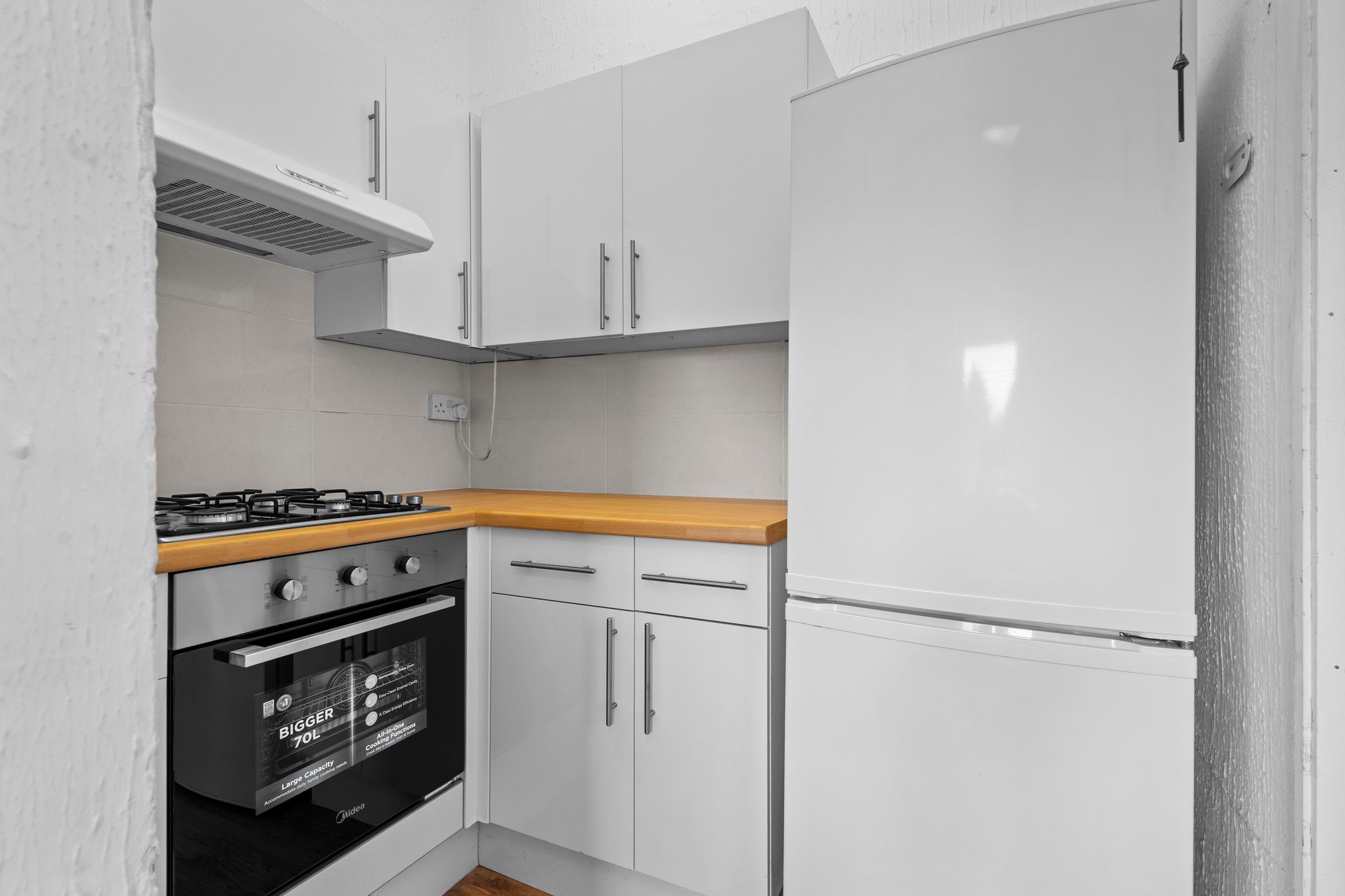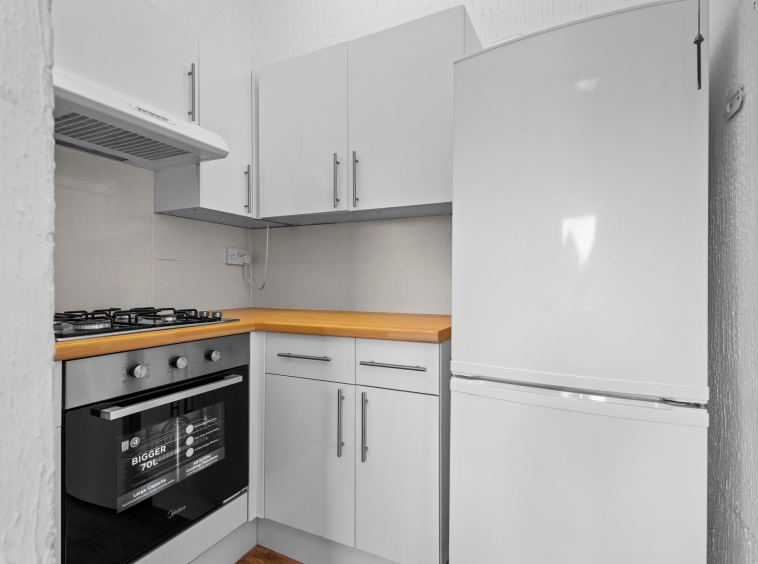 3.28m x 1.99m (10′ 9″ x 6′ 6″) Fully fitted kitchen offering an array of wall and base units, complementory work surfaces, integrated gas hob and electric oven, space for fridge freezer and washing machine, stainless steel sink and drainer, with neutral decor, laminate flooring and double glazed window to the rear.