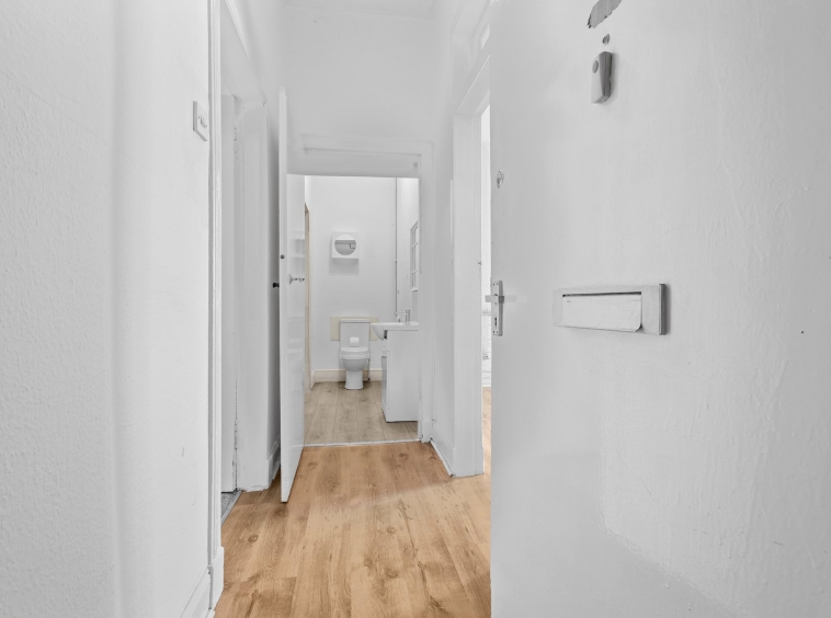 1.11m x 2.79m (3′ 8″ x 9′ 2″) Accessed via well kept communal close, the hallway features neutral decor, laminate flooring, overhead storage and gives access to all apartments.