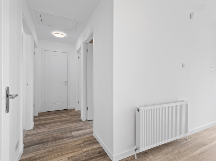 4.22m x 4.21m (13′ 10″ x 13′ 10″) The bright and welcoming hallway offers crisp white decor, laminate flooring, storage cupboard, gives access to all apartments.