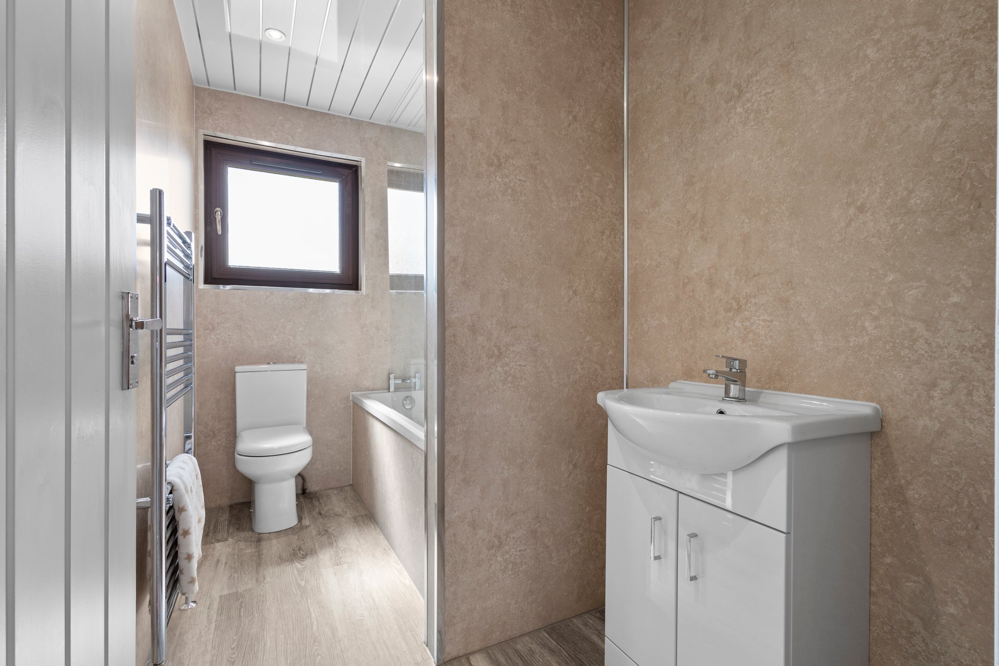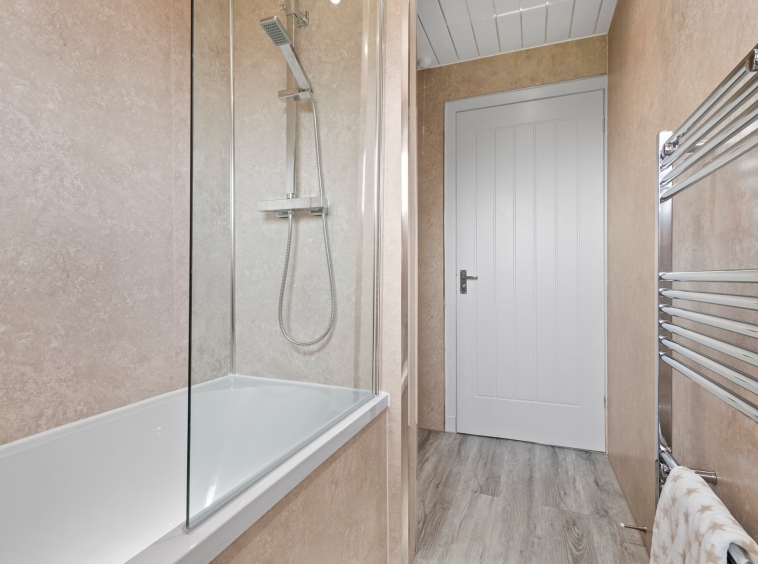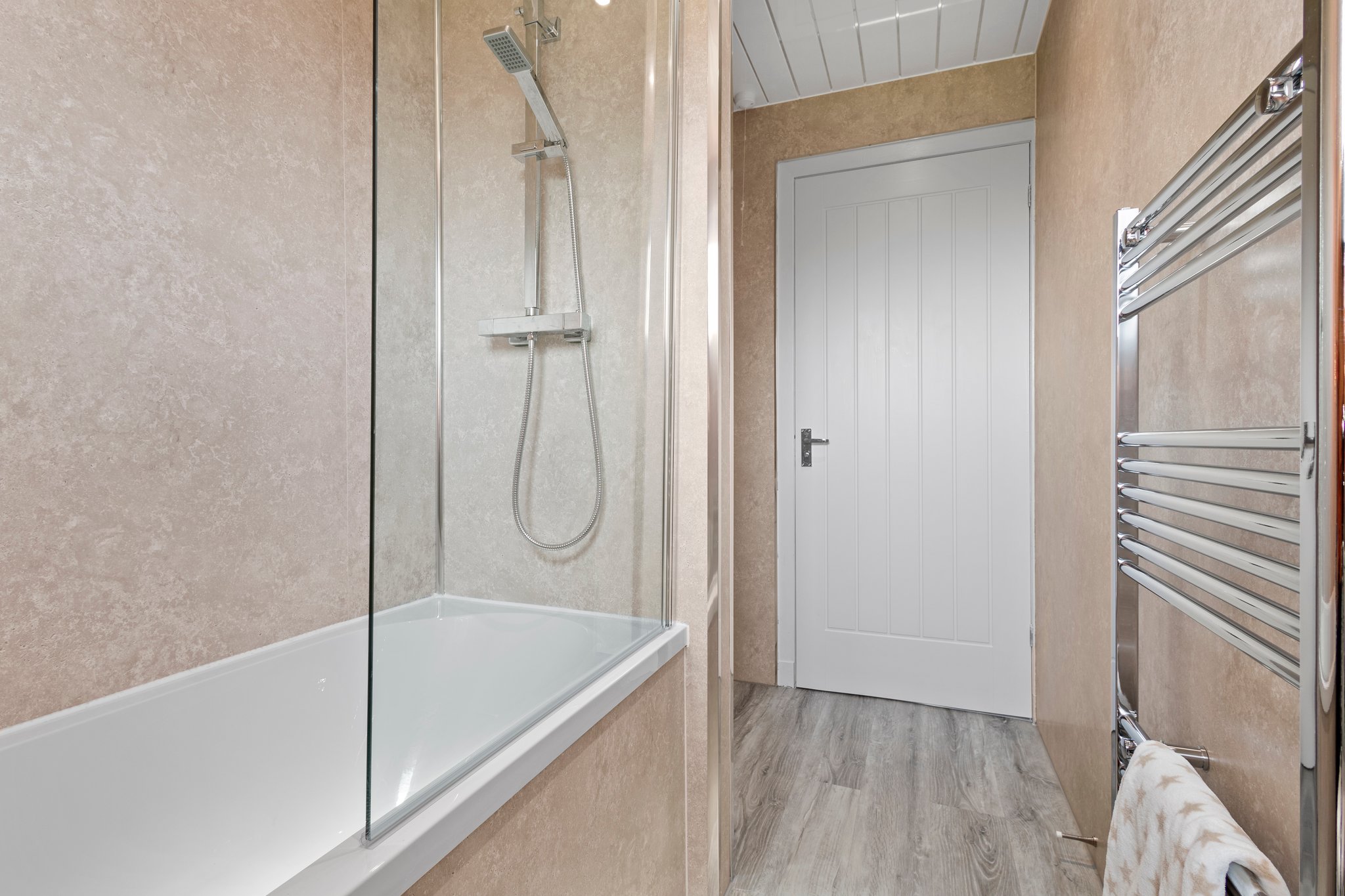 1.59m x 2.97m (5′ 3″ x 9′ 9″) Completing the property is a three piece bathroom boasting modern wet all finish, WC, wash hand basin with vanity storage unit, mains shower over bath, ceiling spotlights, chrome heated towel rail, vinyl flooring and double glazed opaque window to the side.