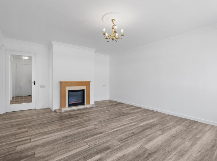 5.29m x 4.22m (17′ 4″ x 13′ 10″) Generous proportioned main apartment featuring fresh crisp white decor, ceiling cornice and central rose, feature electric fireplace, laminate flooring, double glazed window to the front and gives access to the kitchen.