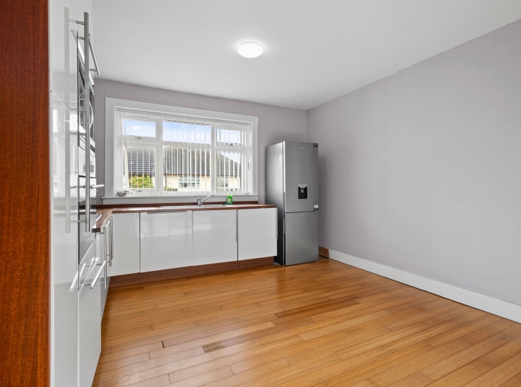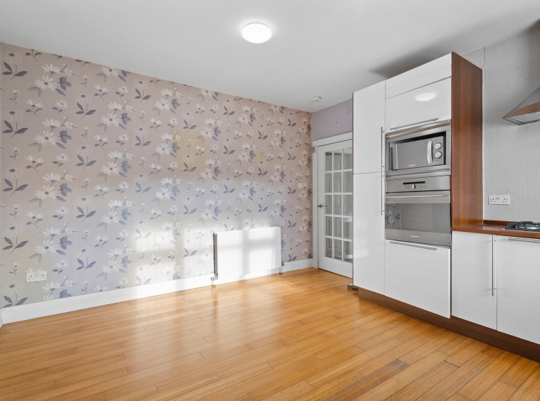 4.52m x 3.98m (14′ 10″ x 13′ 1″) Fully fitted stylish kitchen complete with ample wall and base storage units, complimentary work surface, integrated oven, gas hob, washing machine and dish washer, plumbing and space for fridge freezer, stainless steel sink and drainer, neutral decor, plentiful space for a dining table and chairs, laminate flooring and a double glazed window to the front.