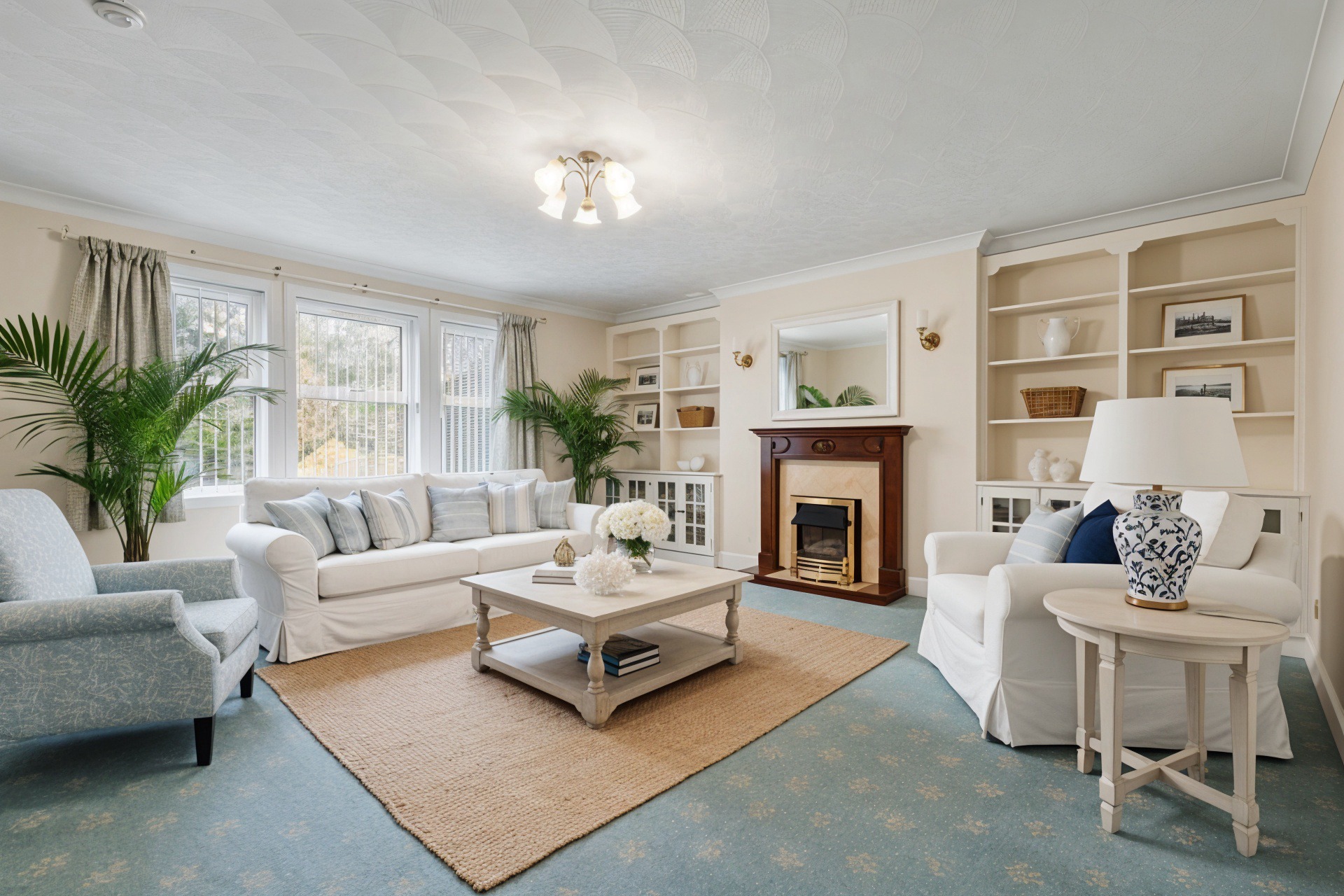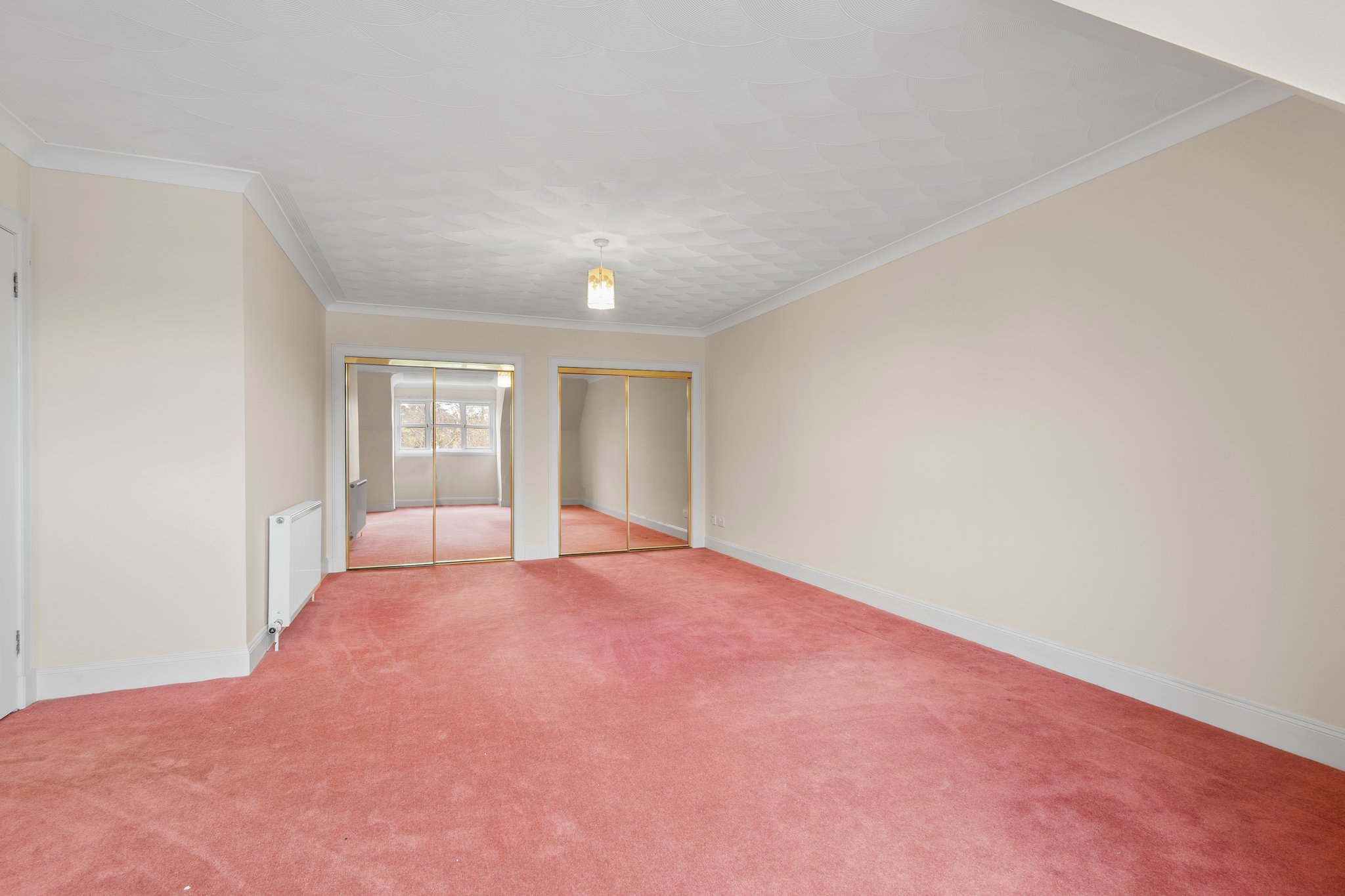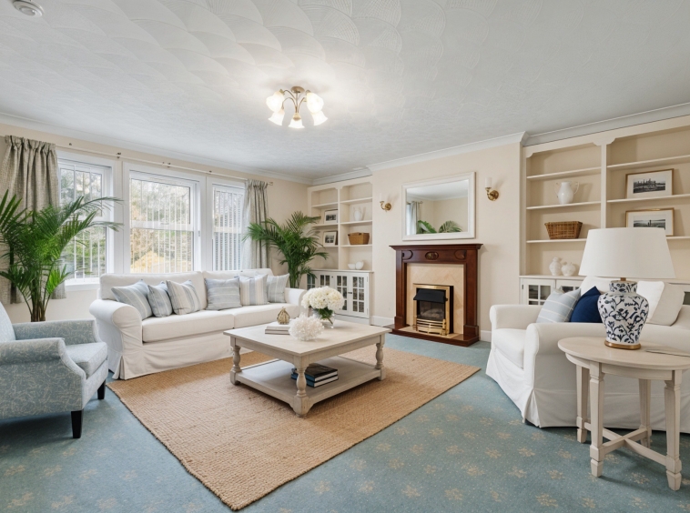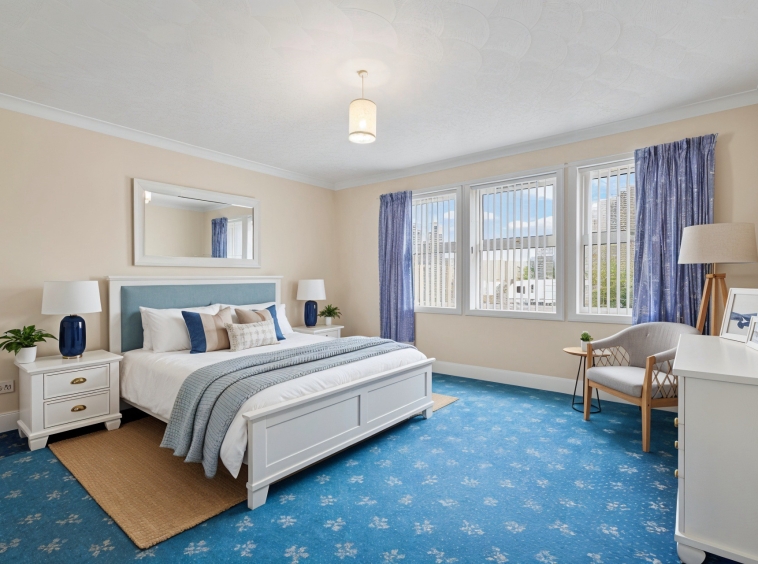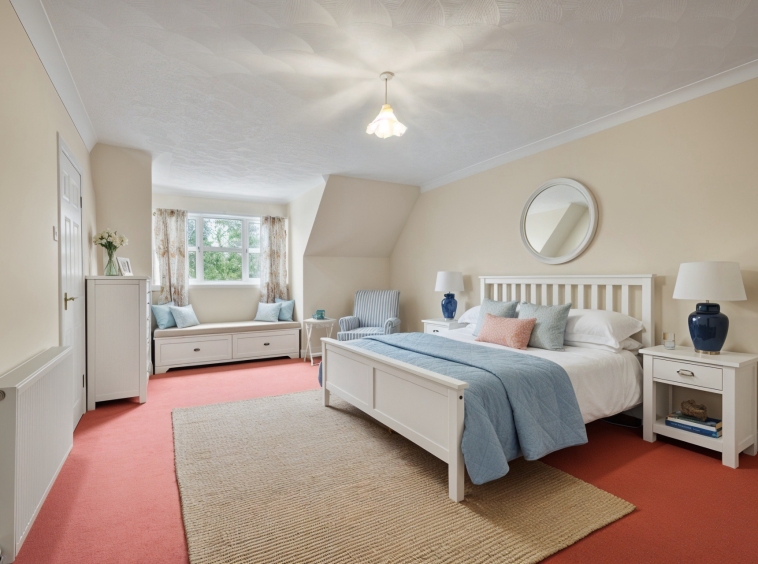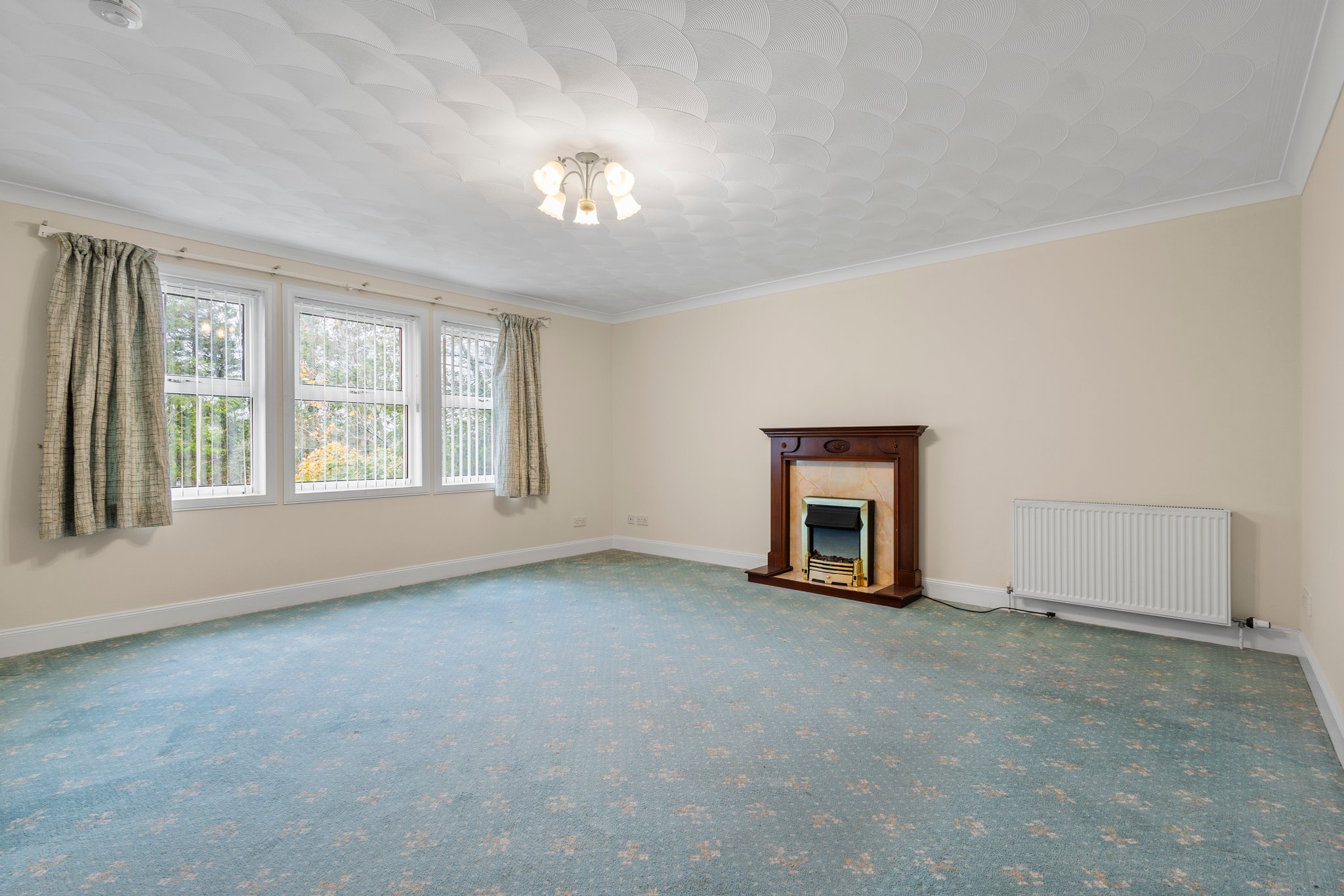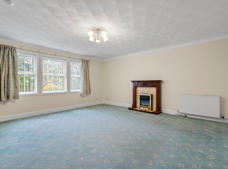 5.07m x 4.98m (16′ 8″ x 16′ 4″) Generously proportioned main apartment offering soft decor, feature fireplace, ceiling coving, fitted carpet and a double glazed window to the front.