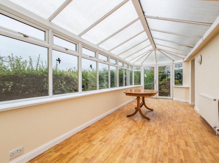 7.69m x 2.71m (25′ 3″ x 8′ 11″) Impressive conservatory providing additional family space with double glazed windows providing open views, neutral decor, plentiful space for free standing furniture and laminate flooring.