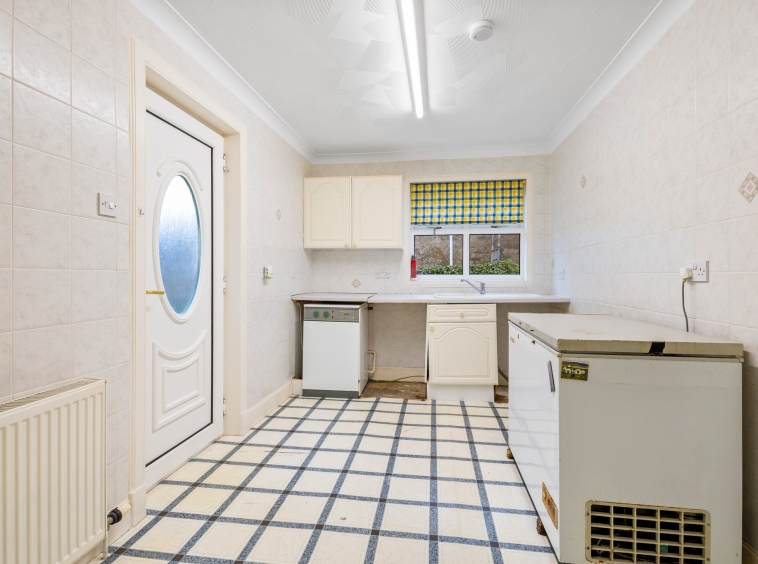 3.95m x 3.49m (13′ 0″ x 11′ 5″) Practical separate utility room providing additional wall and base storage units with complementary work surface, sink and drainer, tiling to walls, vinyl flooring and ceiling coving. Double glazed window to the side and door leading out into the gardens.