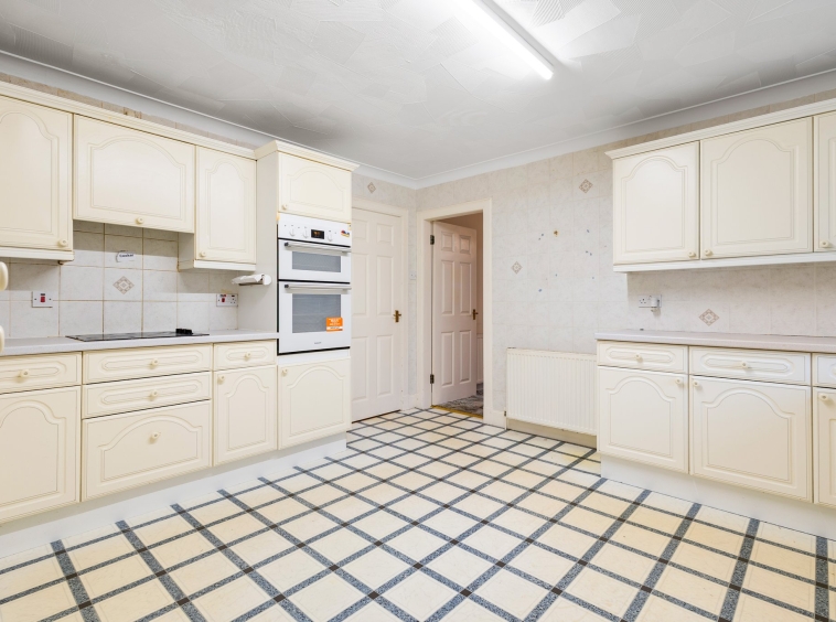 4.27m x 4.05m (14′ 0″ x 13′ 3″) Fully fitted kitchen complete with ample wall and base storage units, complementary work surface, integrated oven, electric hob, integrated dish washer, composite sink and drainer, neutral decor, vinyl flooring, a double glazed window to the rear and access to the utility.