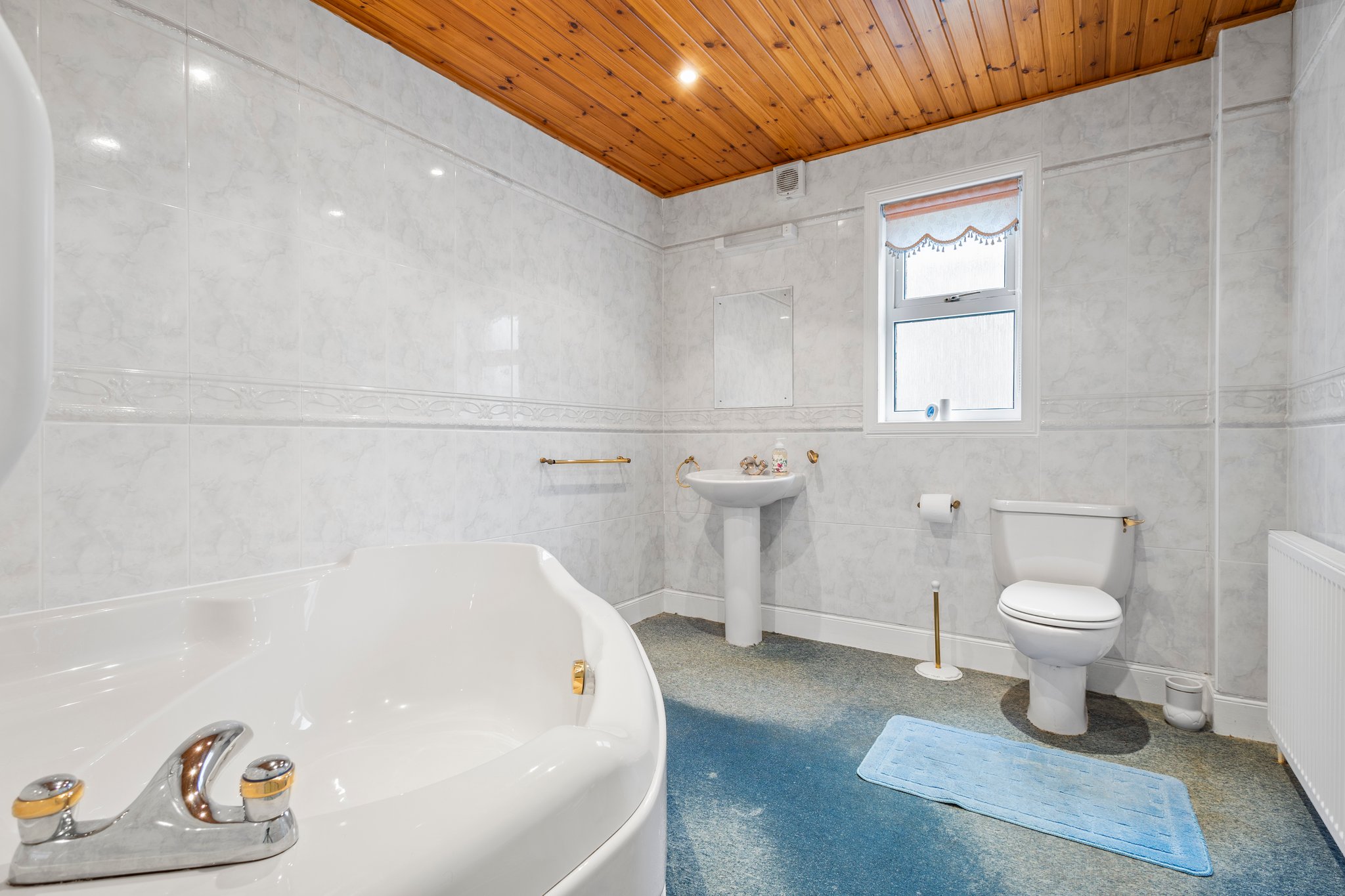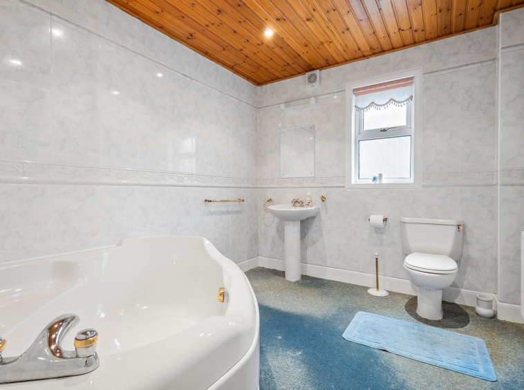 2.51m x 2.92m (8′ 3″ x 9′ 7″) The family bathroom located on the lower level with door access to the second bedroom, comprising of a wash hand basin, large corner bath with over head electric shower, neutral decor, ceiling spotlights, fitted carpet and a double glazed window to the side.
