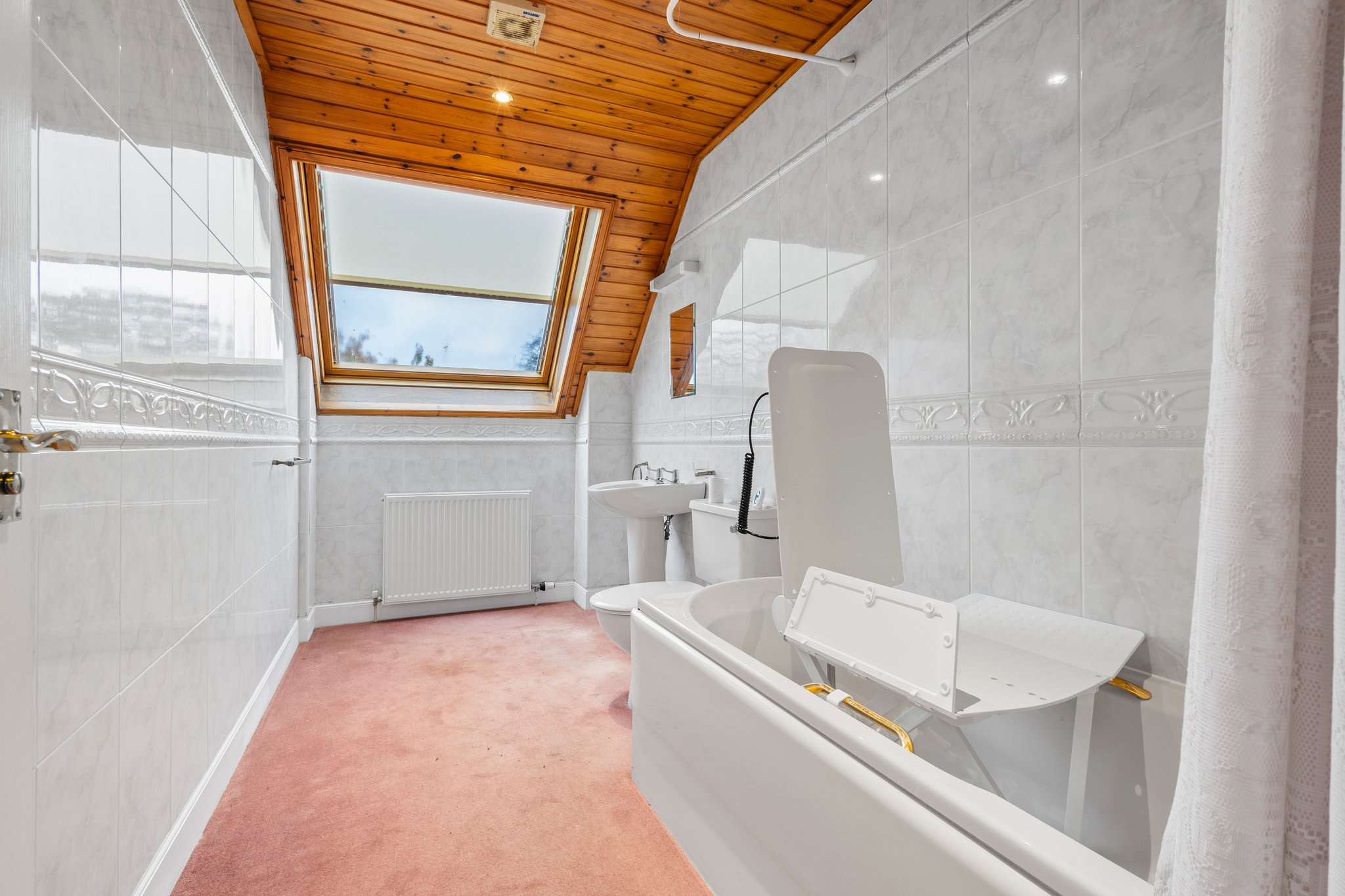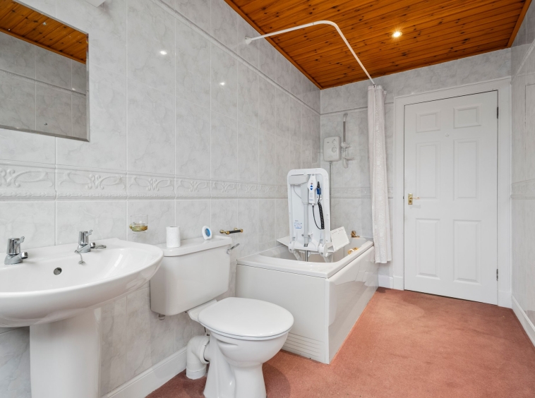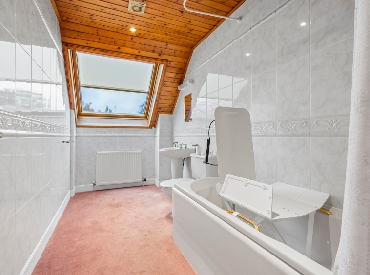 3.79m x 1.91m (12′ 5″ x 6′ 3″) Completing the accommodation is the bathroom comprising of a wash hand basin, wc, bath with overhead electric shower, fully tiled, ceiling spotlights, fitted carpet and double glazed window to the rear.