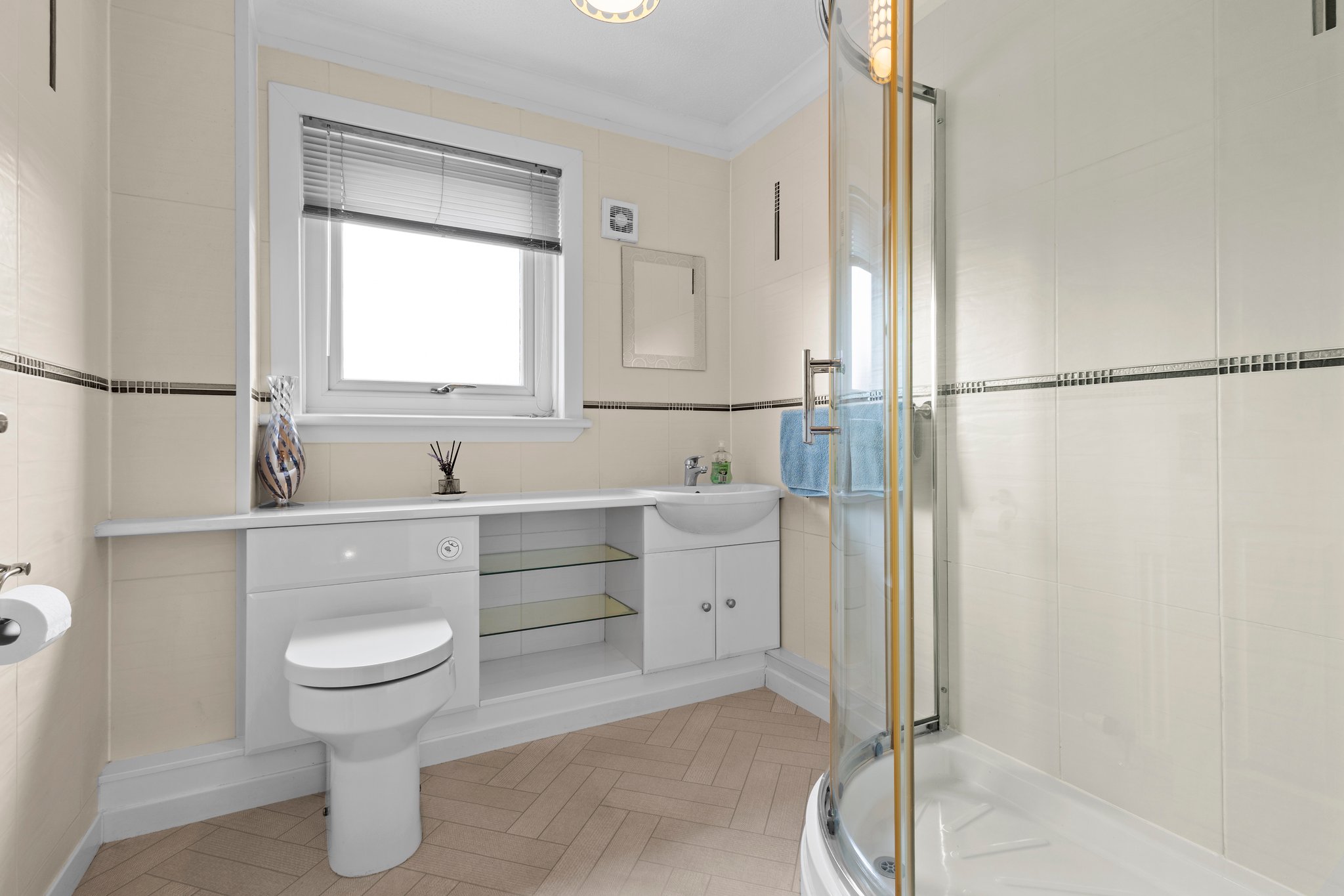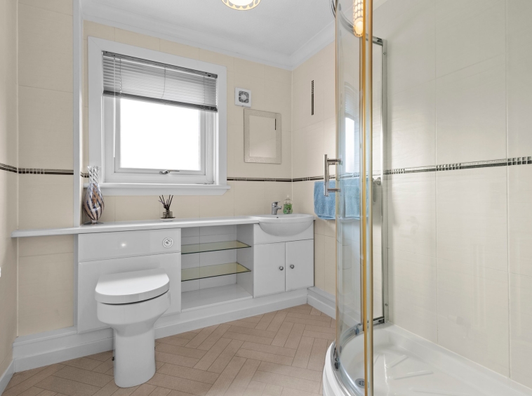 2.32m x 2.09m (7′ 7″ x 6′ 10″) Completing the accommodation is the three piece shower room suite comprising of a wash hand basin with vanity storage, wc and shower cubicle with overhead mains shower. Fully tiled walls, vinyl flooring and rear facing double glazed opaque window.