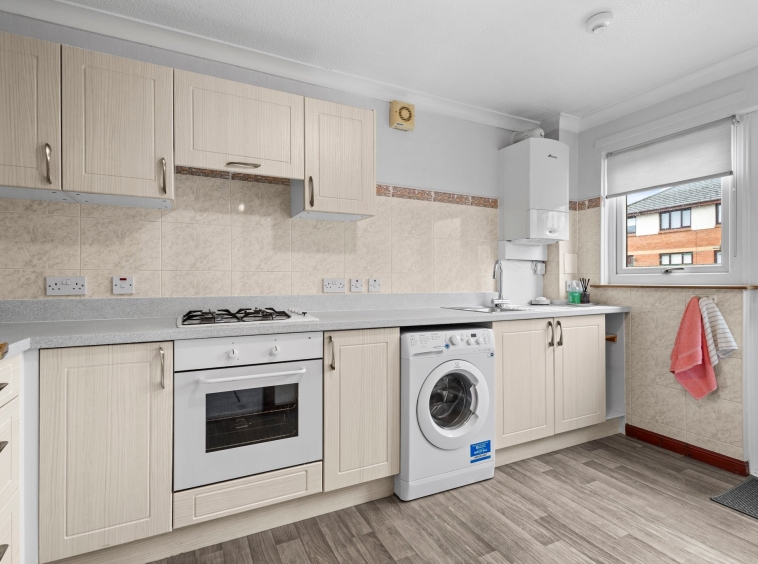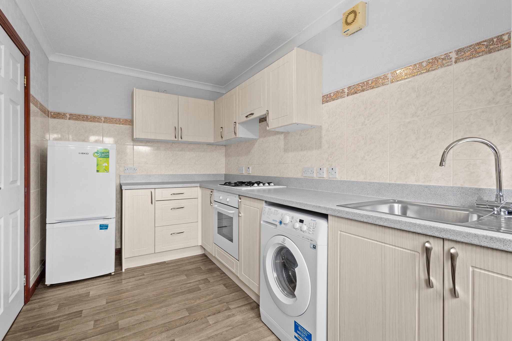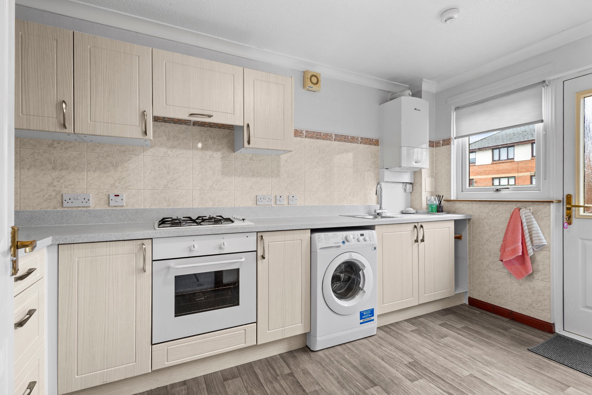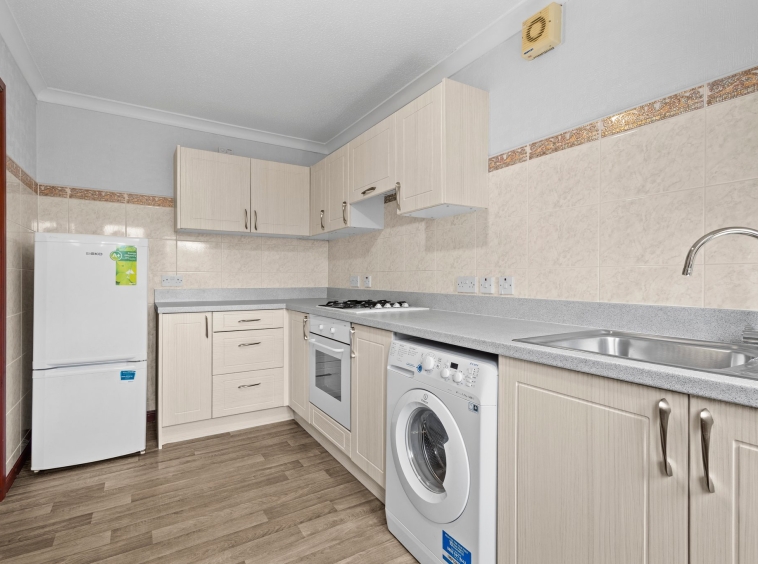 3.93m x 2.12m (12′ 11″ x 6′ 11″) The generous fitted kitchen offers a range of modern wall and base storage units with complementary work surfaces, stainless steel sink and drainer, integrated oven and gas hob. Plumbing/space for washing machine and fridge/freezer, vinyl flooring, neutral decor, double glazed window to the rear and door leading out into the rear gardens.