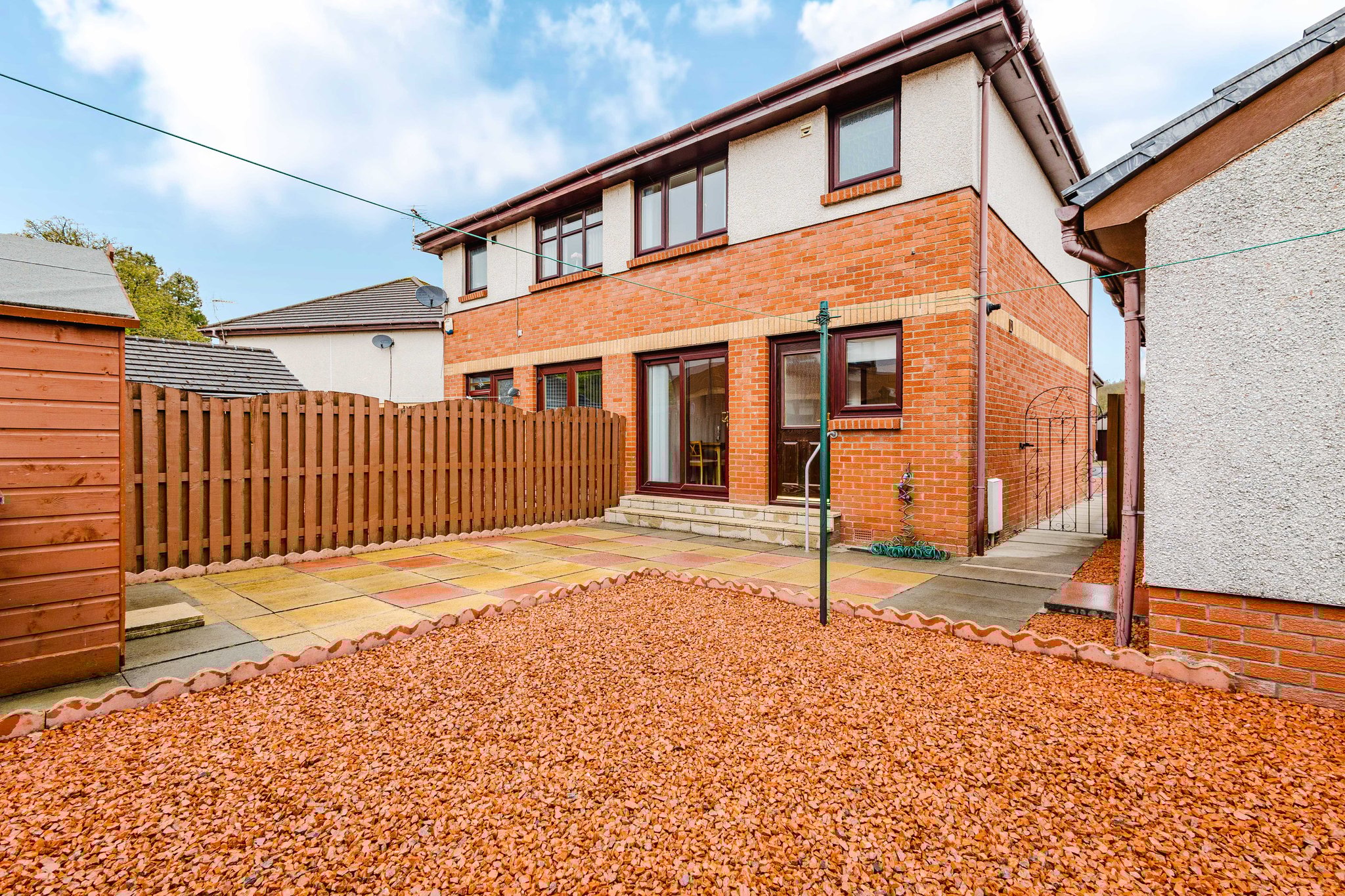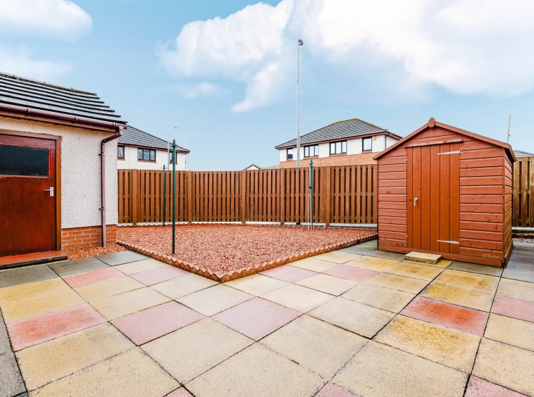 Positioned on a preferred corner plot, this charming villa provides private garden grounds to the front and rear. The front gardens are laid to chips with a generous driveway to the side allowing private off street parking, leading to the detached brick built garage with up and over door access. The rear gardens are landscaped with ease of maintenance in mind comprising of a paved patio, chipped area and shed for storage. Fully enclosed by fencing allowing for a safe and peaceful outdoor family space.