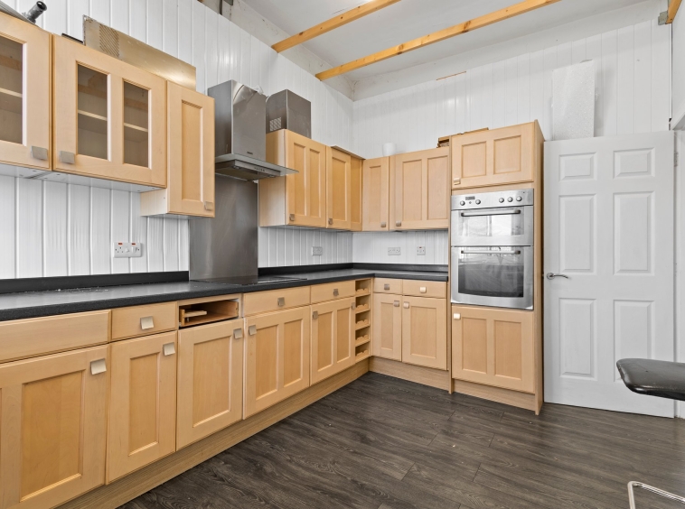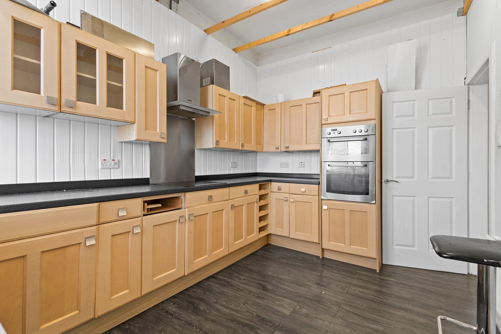 4.26m x 2.76m (14′ 0″ x 9′ 1″) Offering an array of wall and base units, this fitted kitchen features an integrated electric hob and hood, electric double oven, plumbing space for a washing machine, stainless steel sink and drainer, double glazed window to the rear and double glazed opaque UPVC door leading to the terrace.