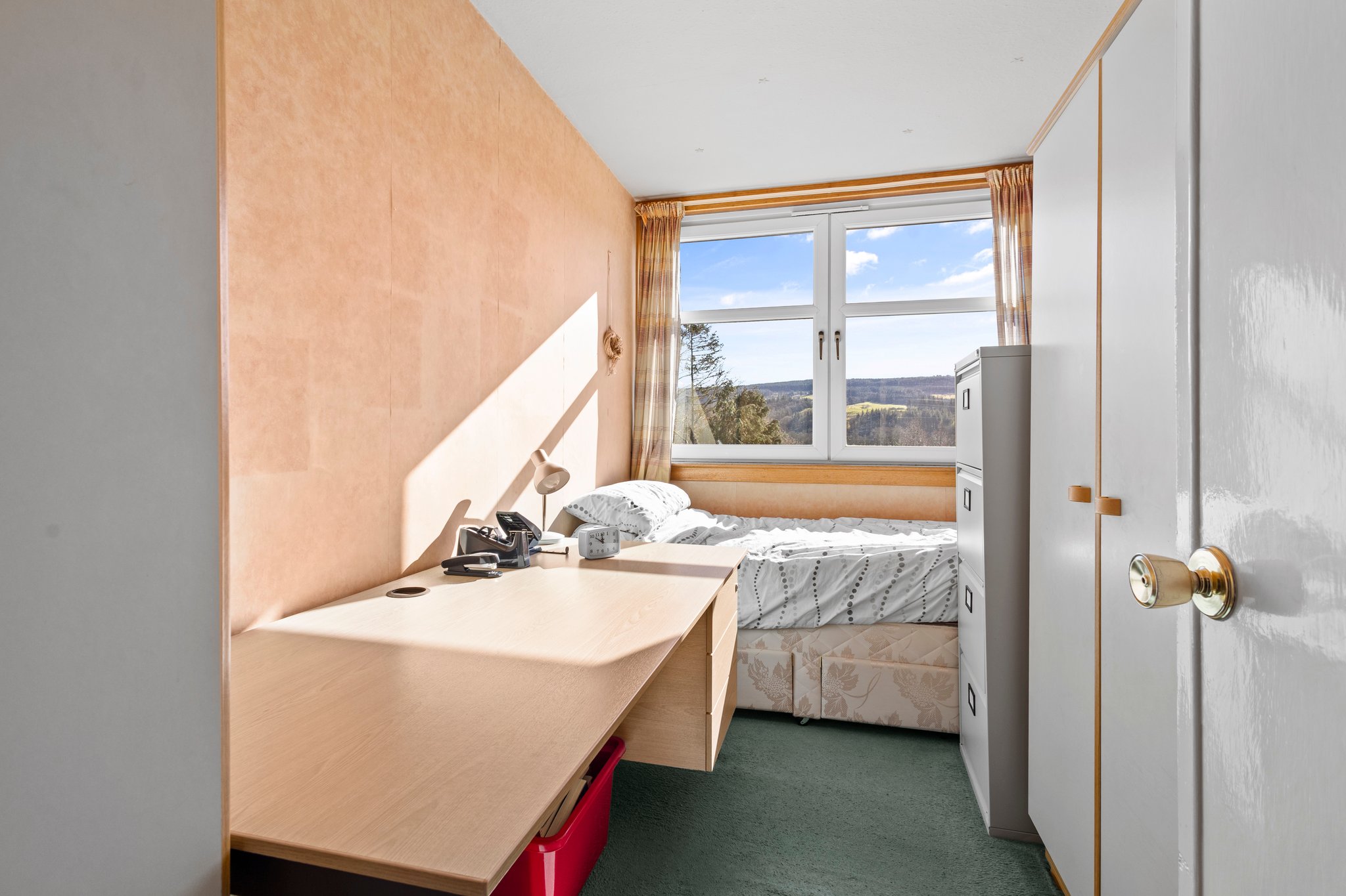 2.16m x 3.54m (7′ 1″ x 11′ 7″) Bedroom three is a good sized apartment, flexible in use offering neutral decor, practical storage cupboard, deep skirtings, fitted carpet and a double glazed window to the front.